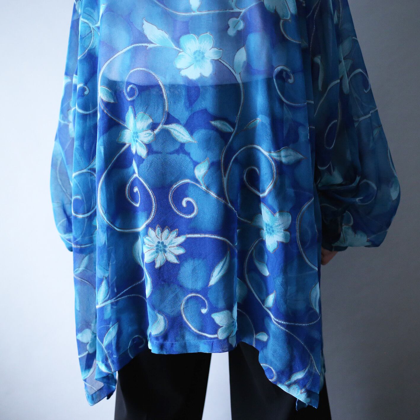 夏空の下、眩いばかりに映える美しいブルーの花柄オーバーシルエットシースルーシャツ