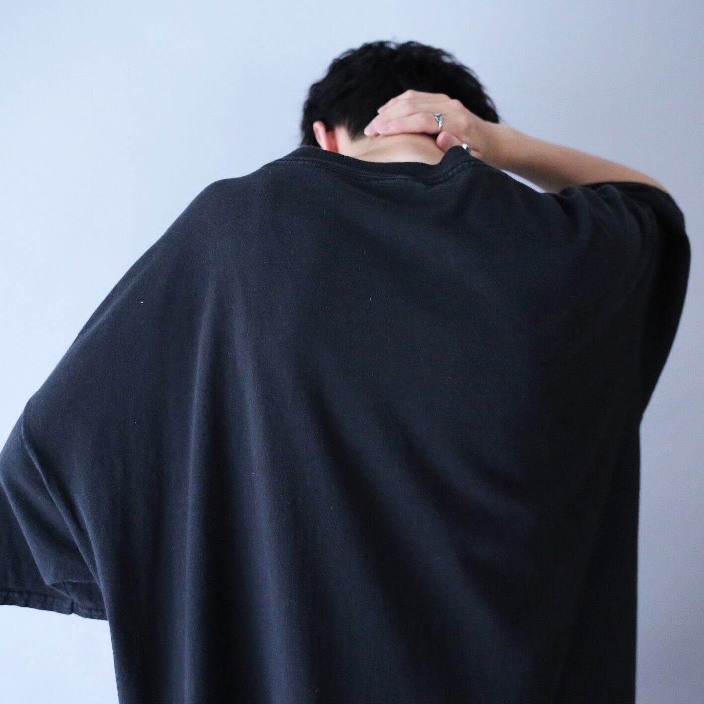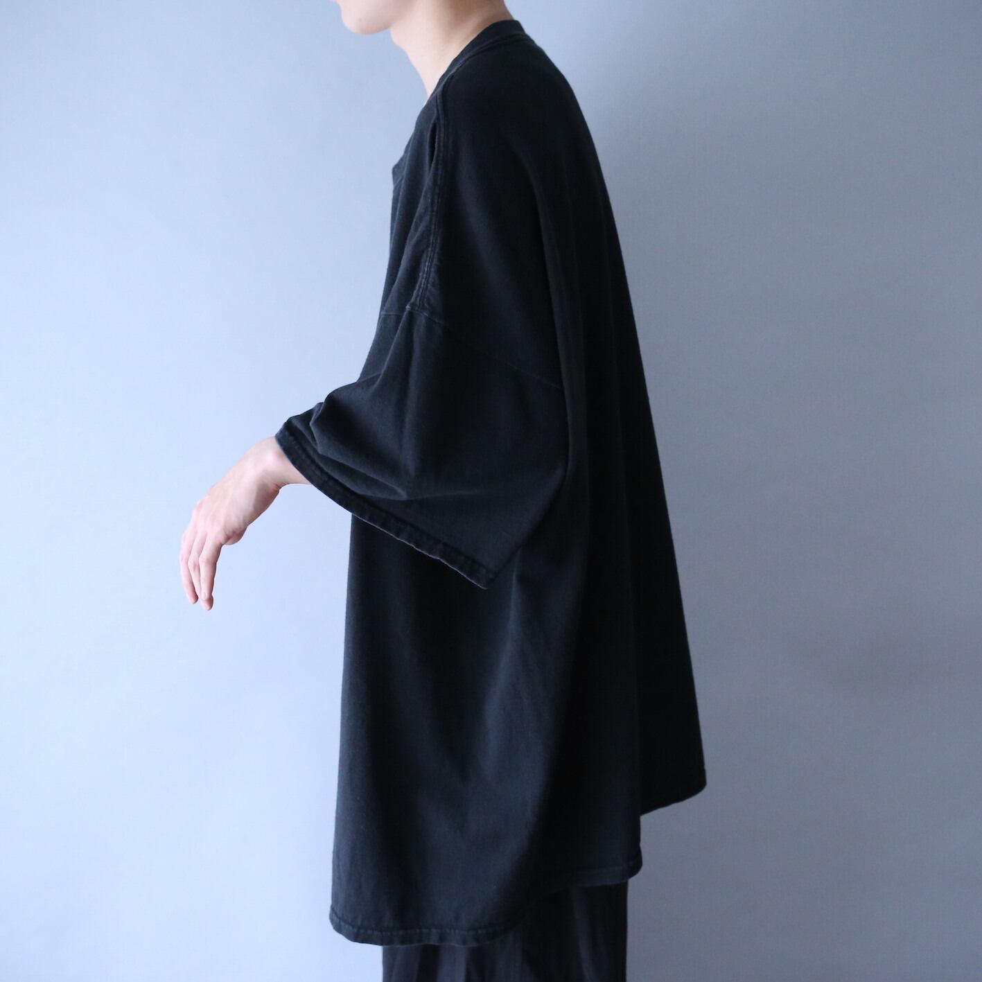 着丈77cmに対して身幅78cmのT-シャツではあり得ないほどのワイドな作り、袖もたっぷり肘を覆うほどのロング丈なので今の着こなしっぽくルーズに楽しめます◎