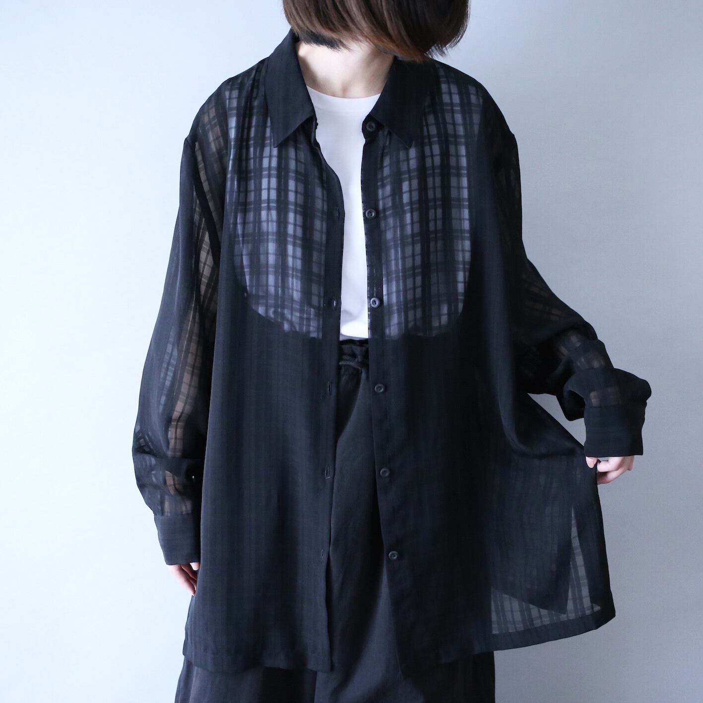 モードに映える黒単色、男性でも余裕で羽織れるオーバーシルエットの極上シースルーシャツ