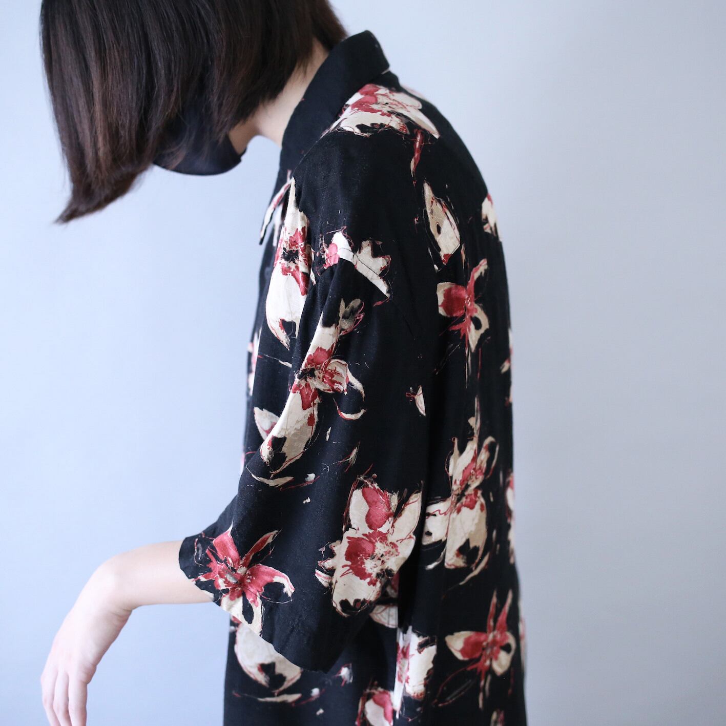 花そのもの描いたというよりかはどこか抽象画のようなタッチで描かれた珍しい花柄、このアンニュイな感じがたまらなくイケてます