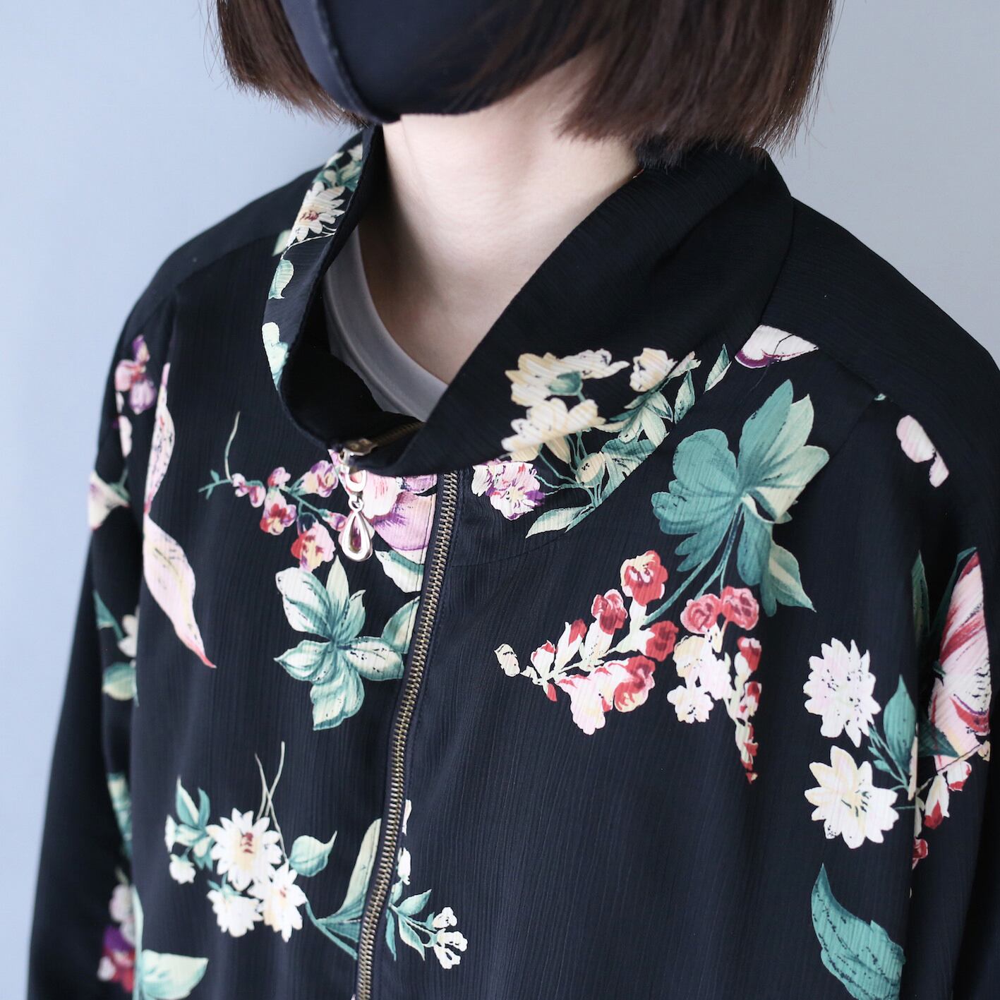 シックなブラックをベースに大判でアーティスティックな花柄を施したオーバーシルエットハイネックブルゾン