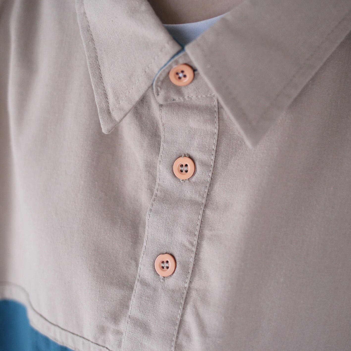 身頃は優しい印象のくすみベージュ、前面には横一線に切り替えが施されておりその内部にも細かい切り替えを加えてデザインにギミック感をプラス