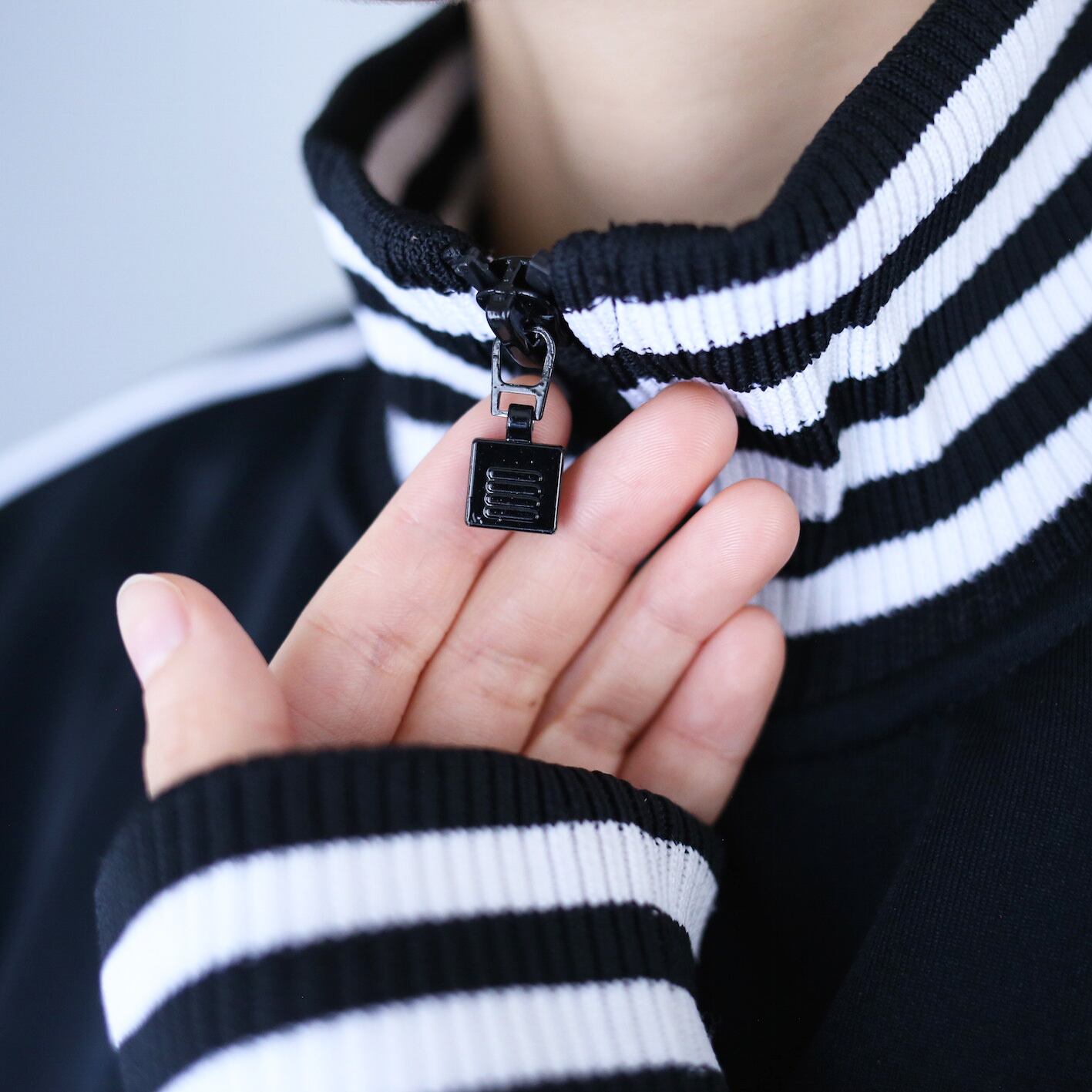 ブラックボディに映える襟×裾×袖口のボーダーニットリブ