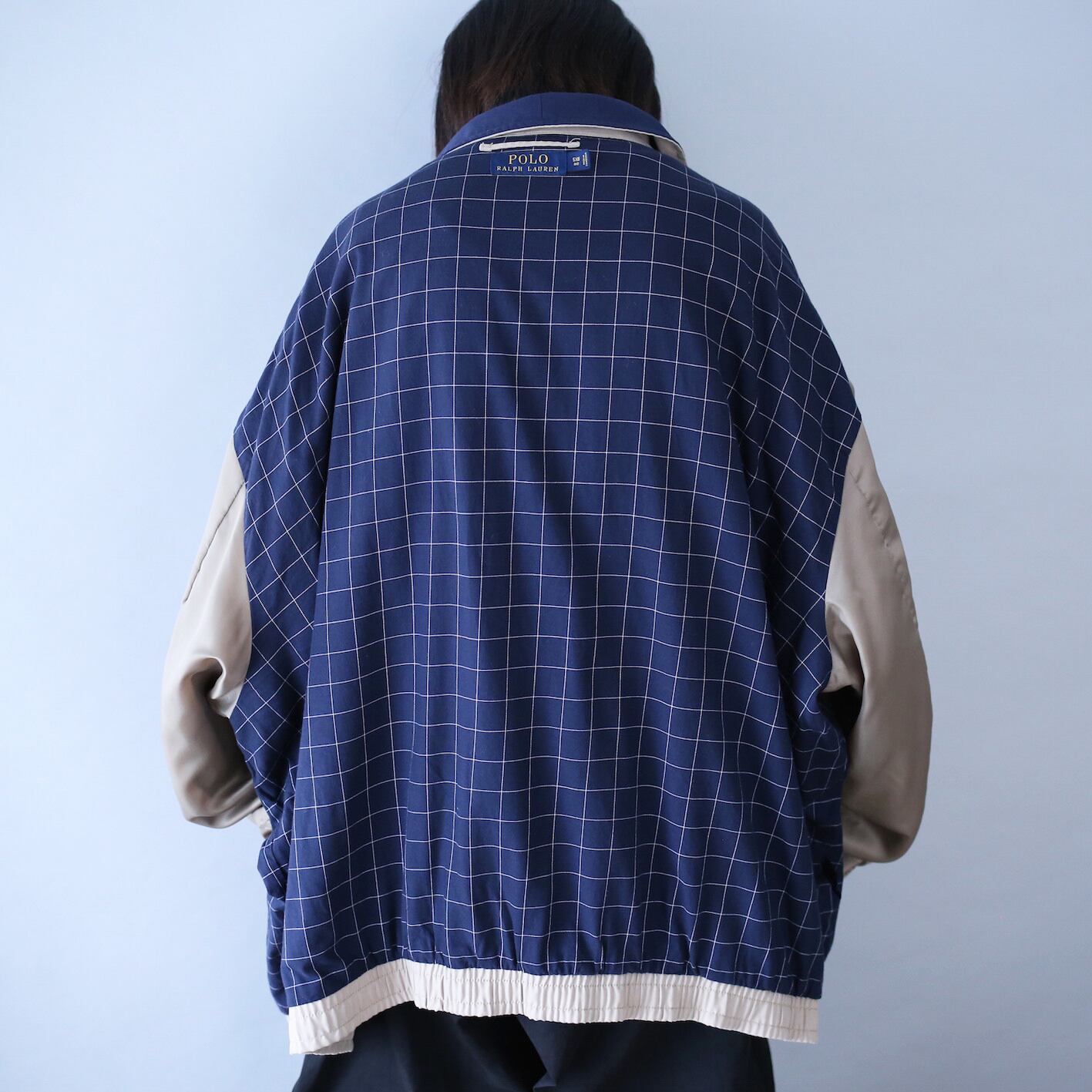 身頃は無地ベージュとネイビーの格子柄の絶妙〜な切り替え、袖は光沢感のあるサテン生地、襟はネイビー、この切り替えが本当に格好良い