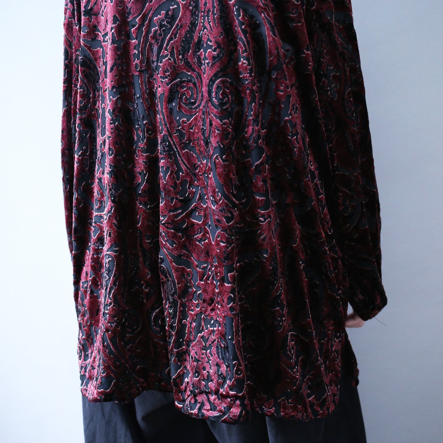 ベースとなっているのはきめ細か〜く透け感が刻まれた黒のメッシュシャツ、その上になんとも形容し難い奇才感溢れる禍々しい柄をベロア生地が服全体にオン