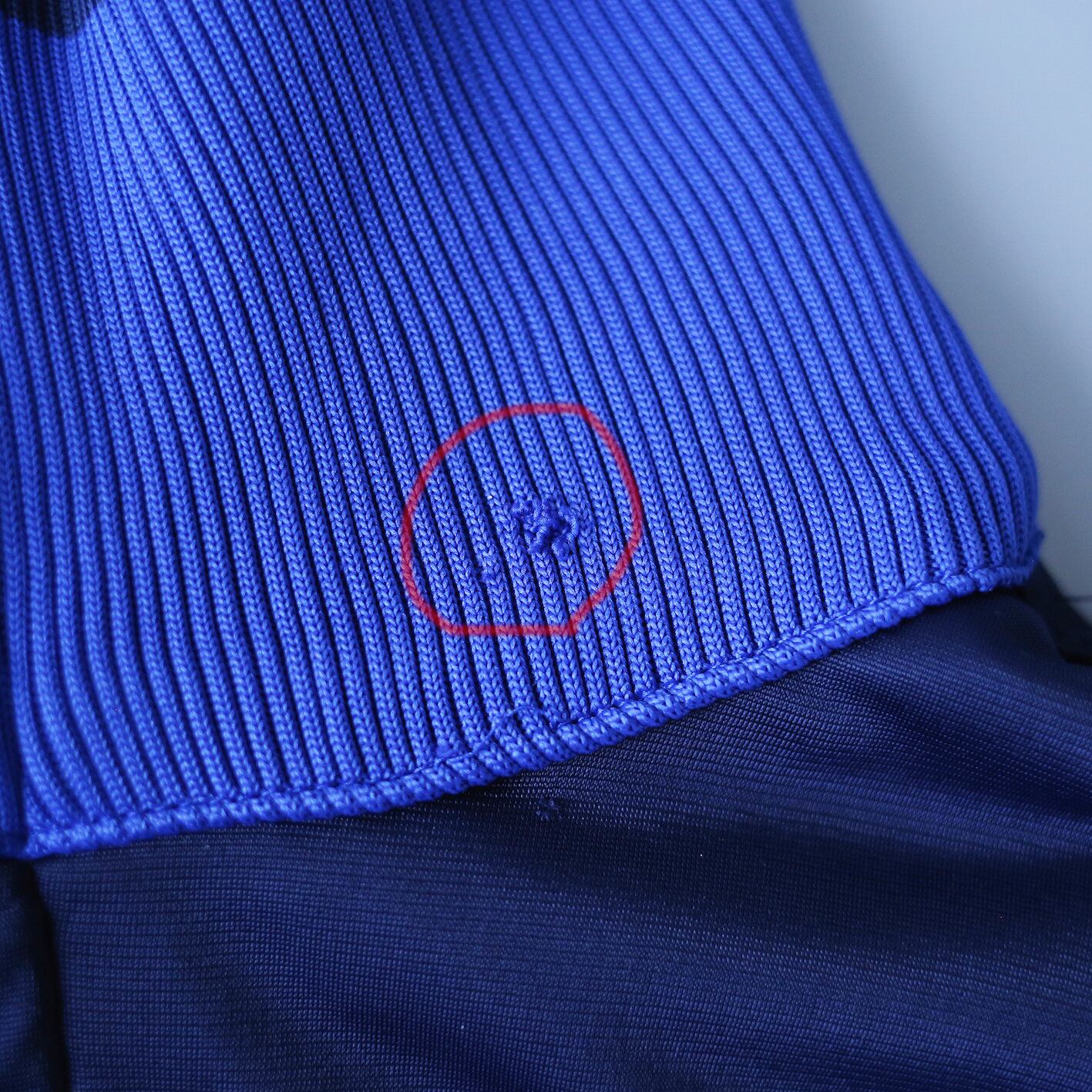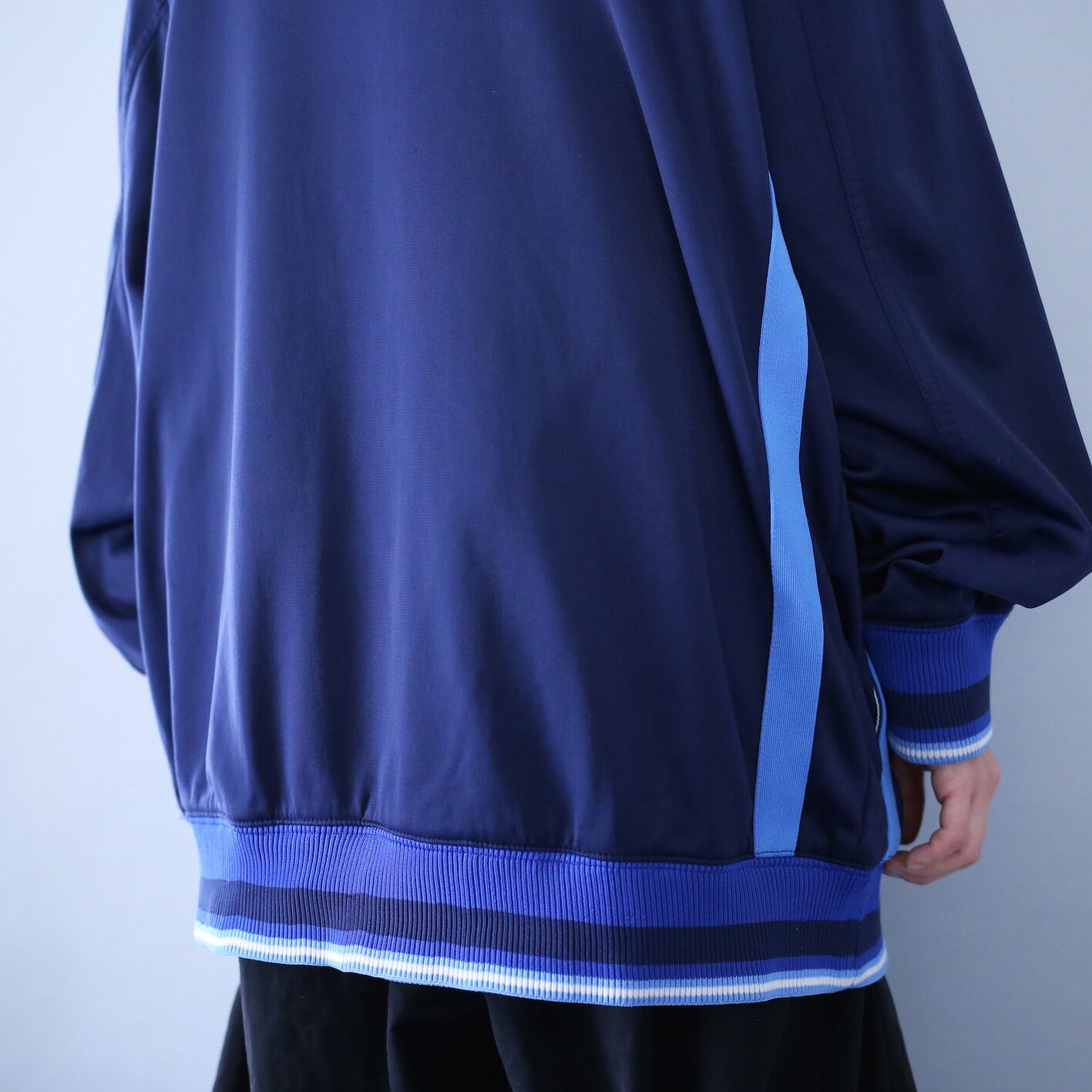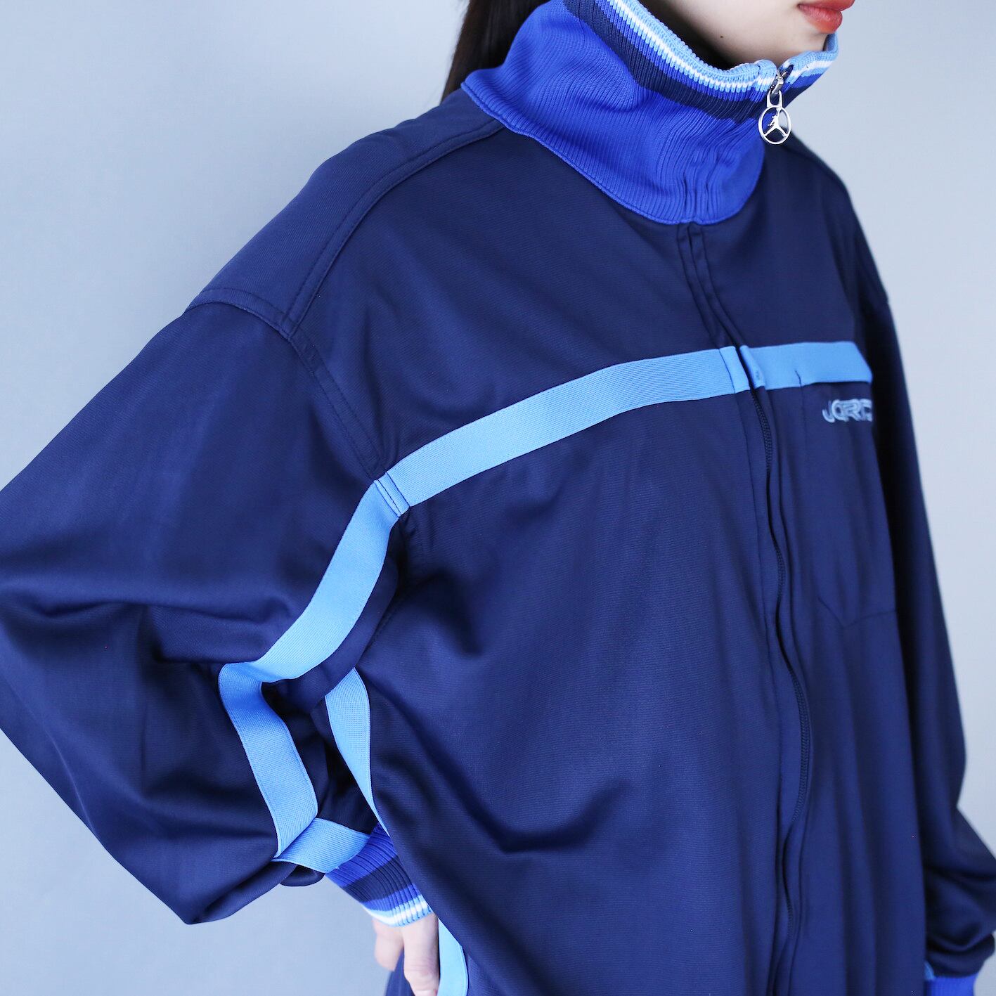 深〜いネイビーをベースにした美しいカラーリング、両脇の下には2本ライン、さらに胸を横切り袖口にかけてラインがスッと施されておりアクセントをプラス◎