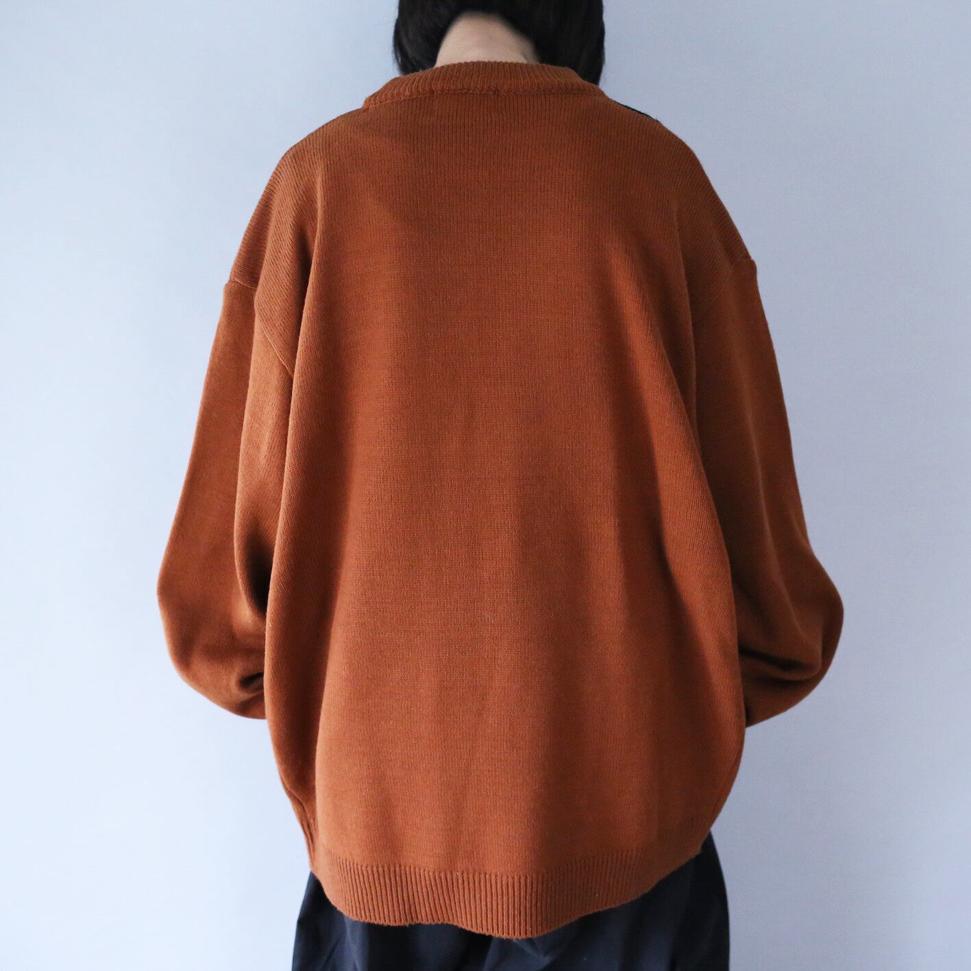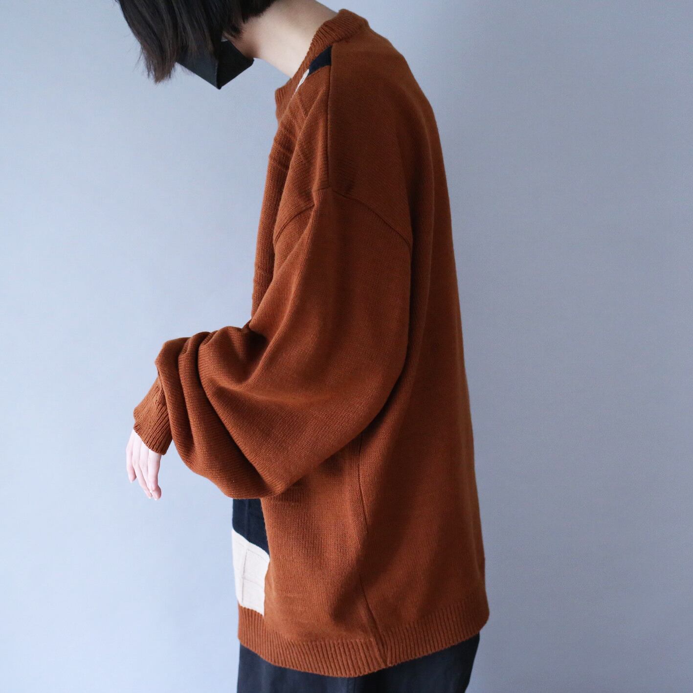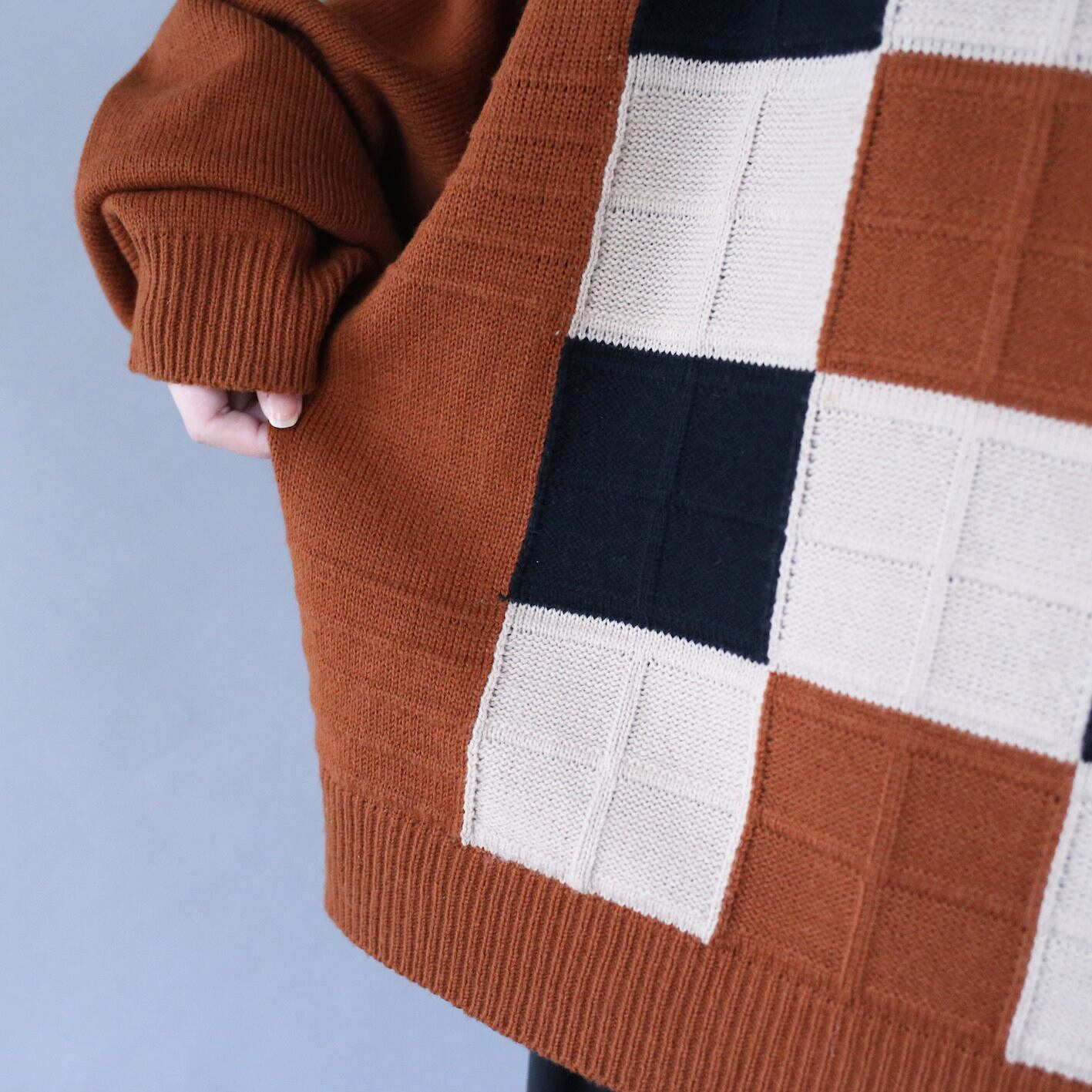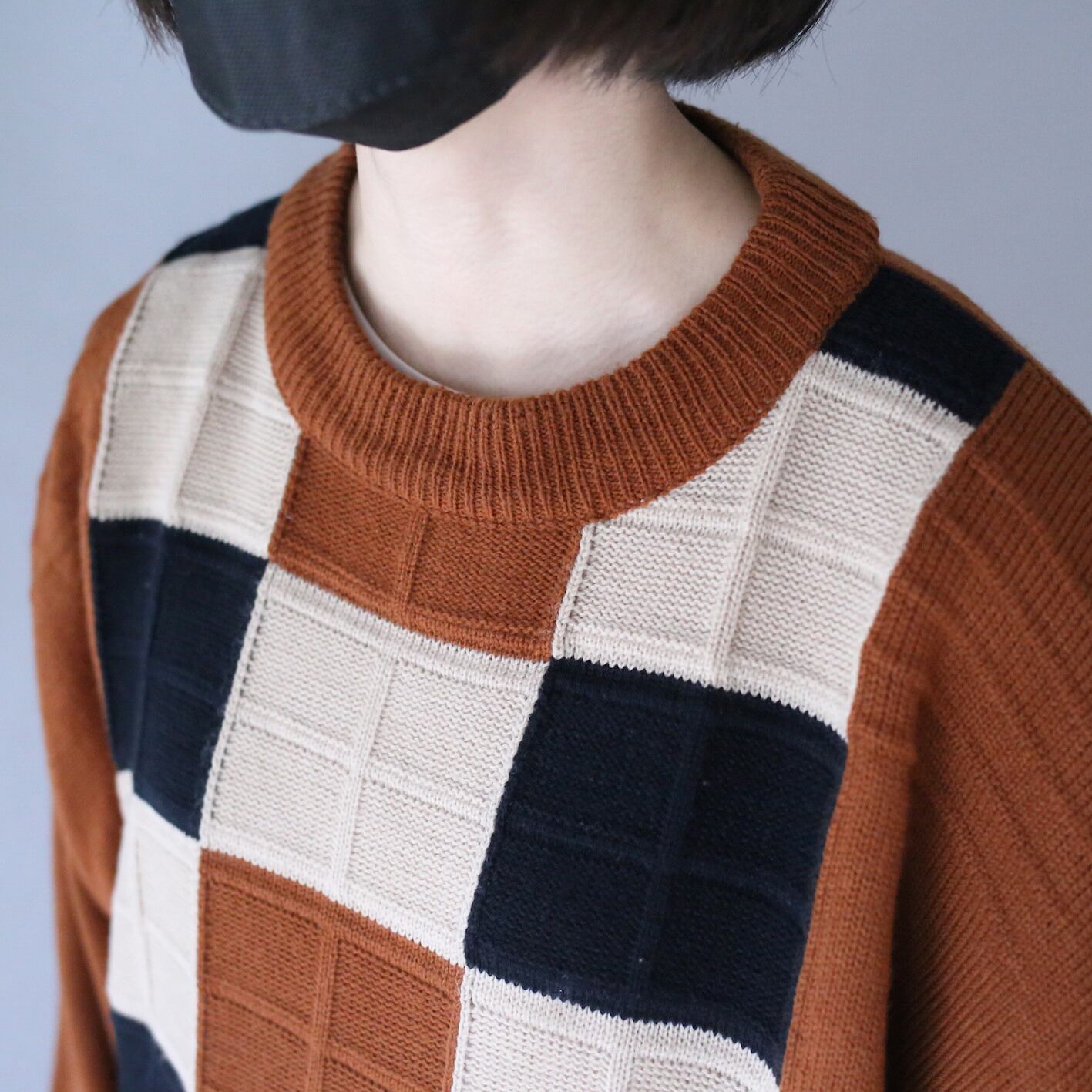 秋らしい深みのあるブラウンカラー、フロントには立体的な3Dラインと大判なパネル柄を施したオーバーシルエットニット