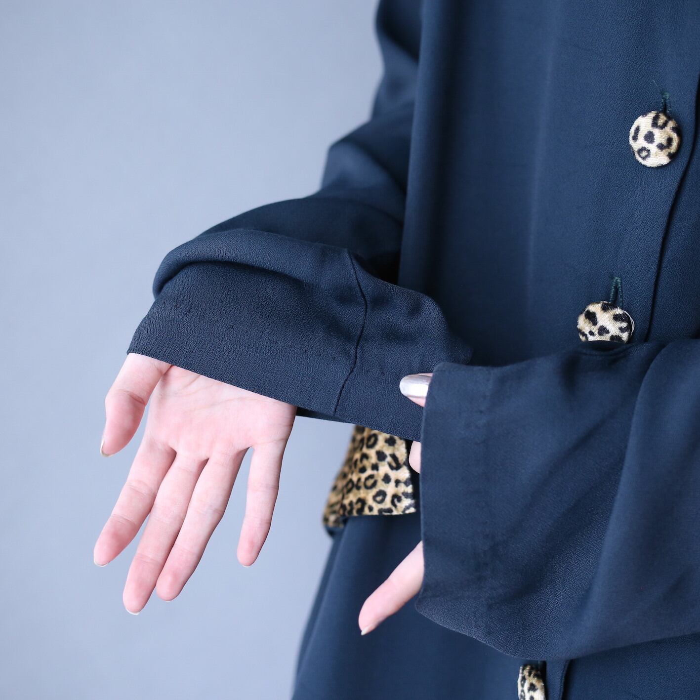 襟やボタンにはヒョウ柄のベロア生地を乗せることでハイセンスなデザインへと昇華