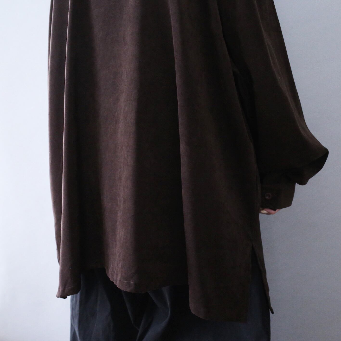 さらに珍しさに拍車をかけるのがメンズ3XL相当のオーバーサイズ、フェイクスエードの肉厚な生地感も相まってシャツとしてだけでなく、この下にシャツを重ねてアウター感覚として使うことも◎
