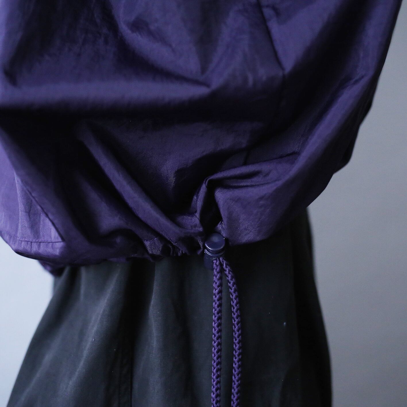 カラーは黒に近いシックさを放つ深めの紫色、ナイロン生地特有の光沢感が相まって陰影が映え服全体をラグジュアリーにコーティング