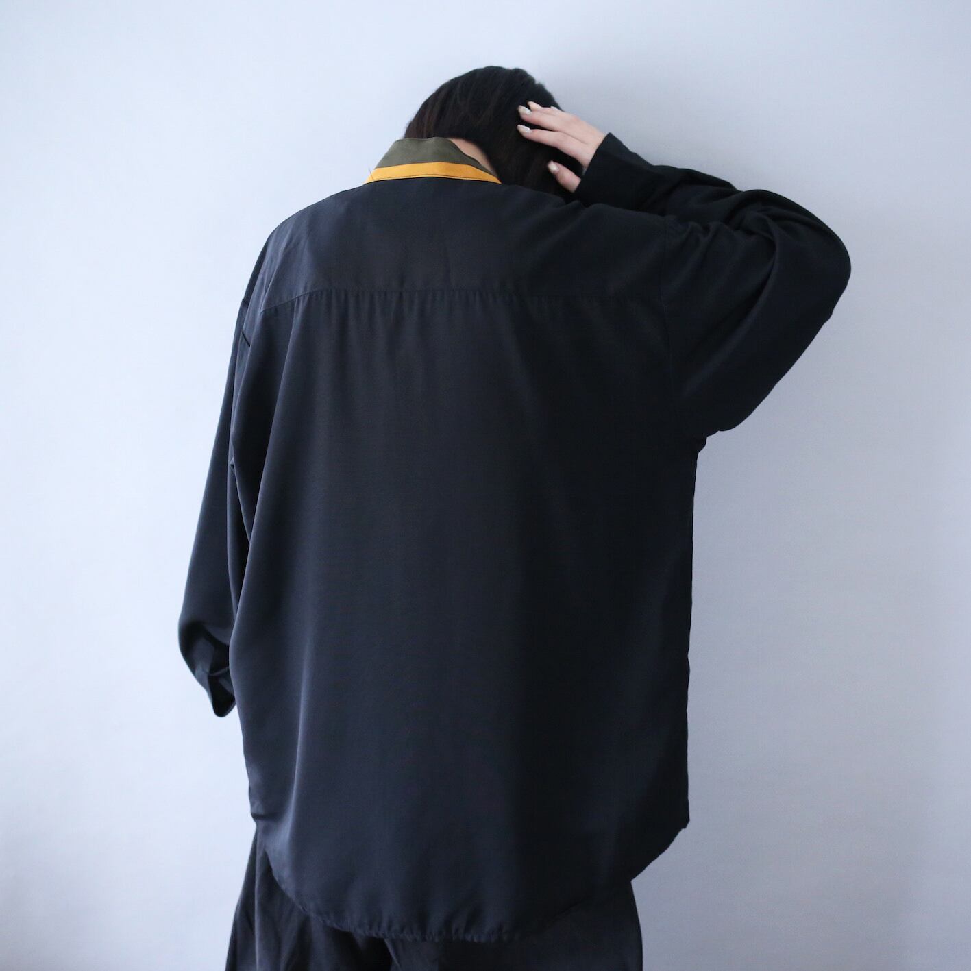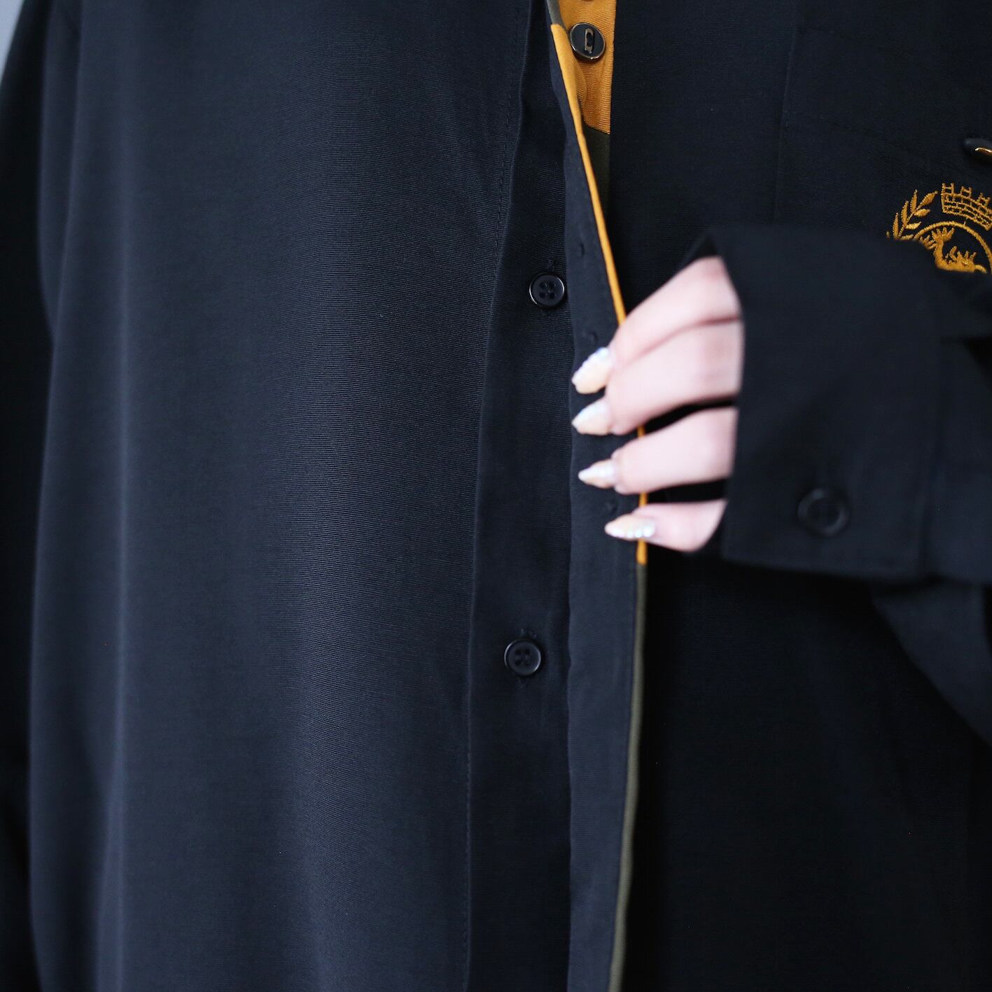 巧みなまでの"マスタード×カーキ"のバイカラー切り替え、胸元には刺繍、比翼部分には計10個の装飾ボタンを加えた極上デザインシャツ