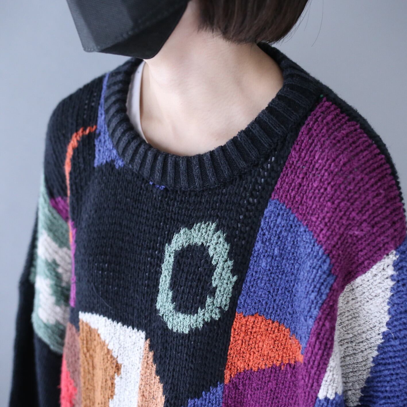 モードに映える黒をベースに幾何学的でアーティスティックな世界観を放つ柄を施したオーバーシルエットニット
