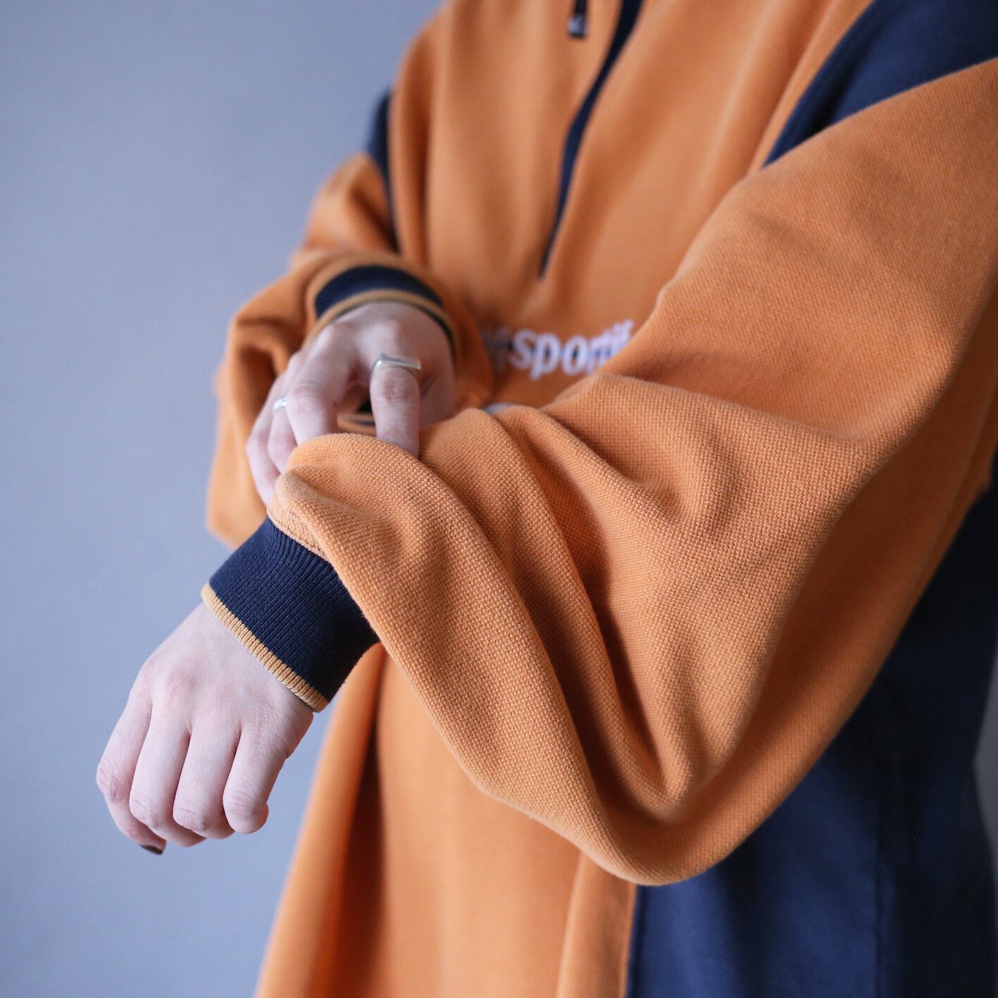 "オレンジ×ネイビー"の配色バランスも絶妙でコレ一枚でも様になりますし、インナーとしてと差し色使いできるのも嬉しいトコロ◎