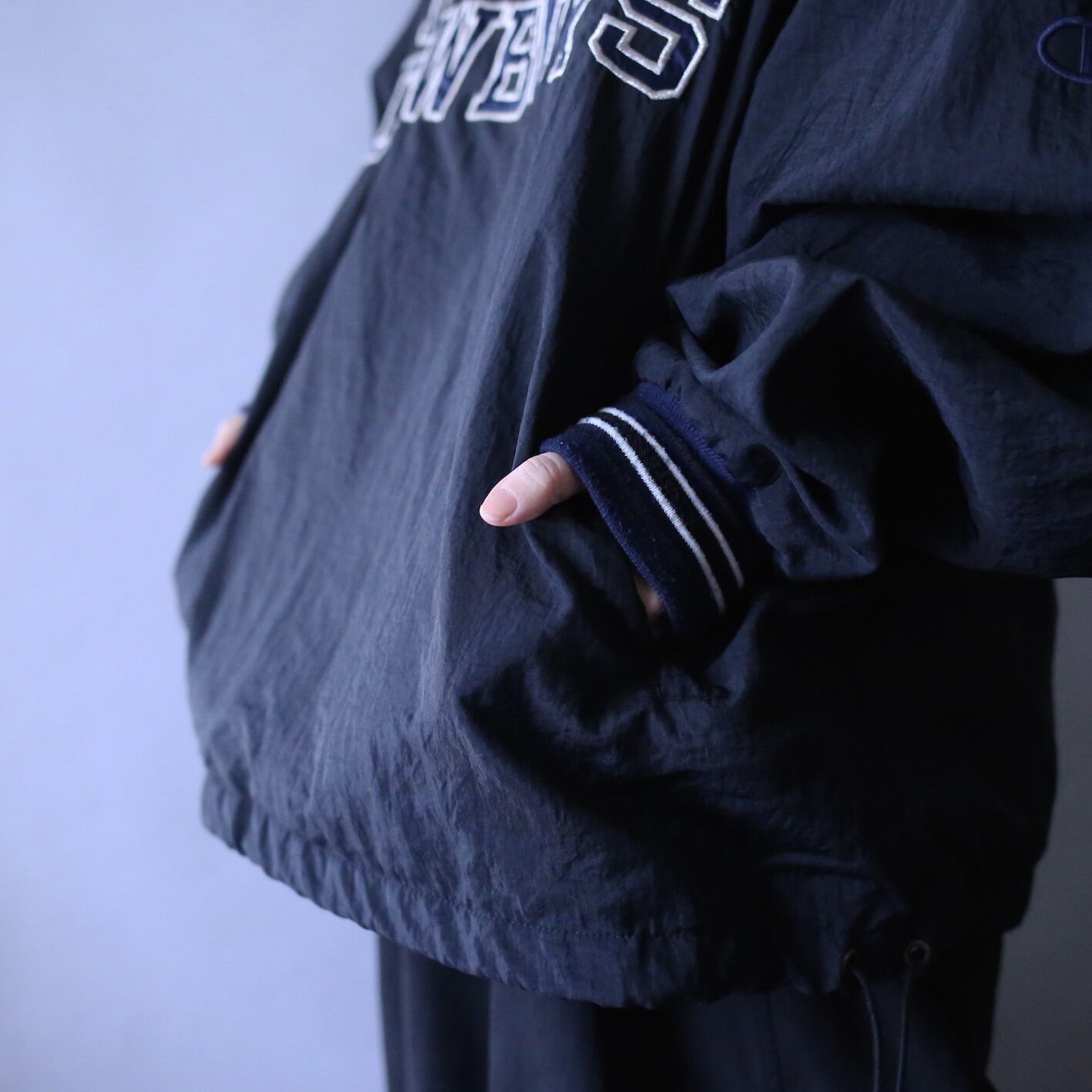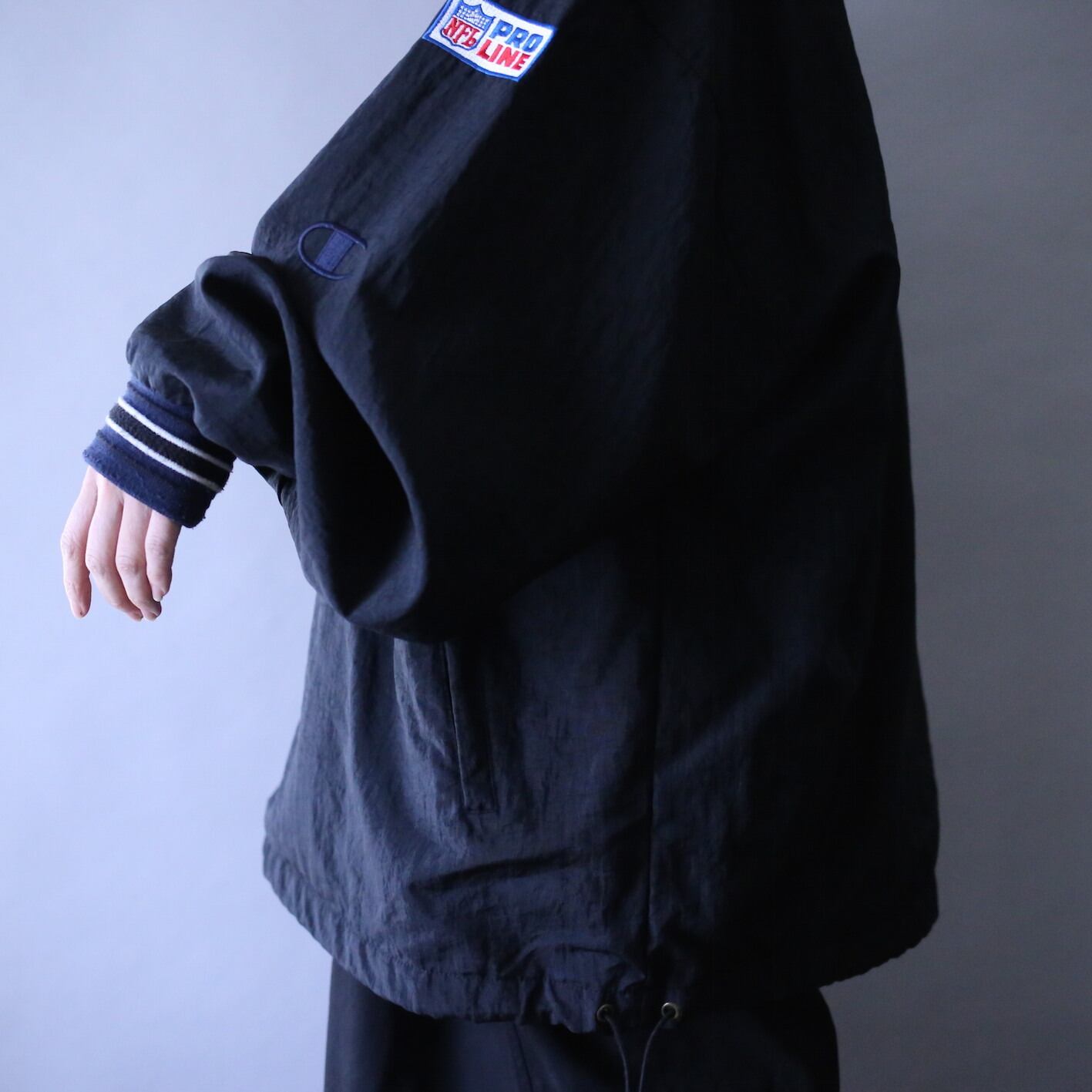人気の高いチャンピオンのナイロンプルオーバーで尚且つ非常〜に珍しい"黒"、サイズ感や細かいデザインも申し分なく、さらに"NFL"とのコラボ、コレは間違いなくスペシャルな逸品です〜