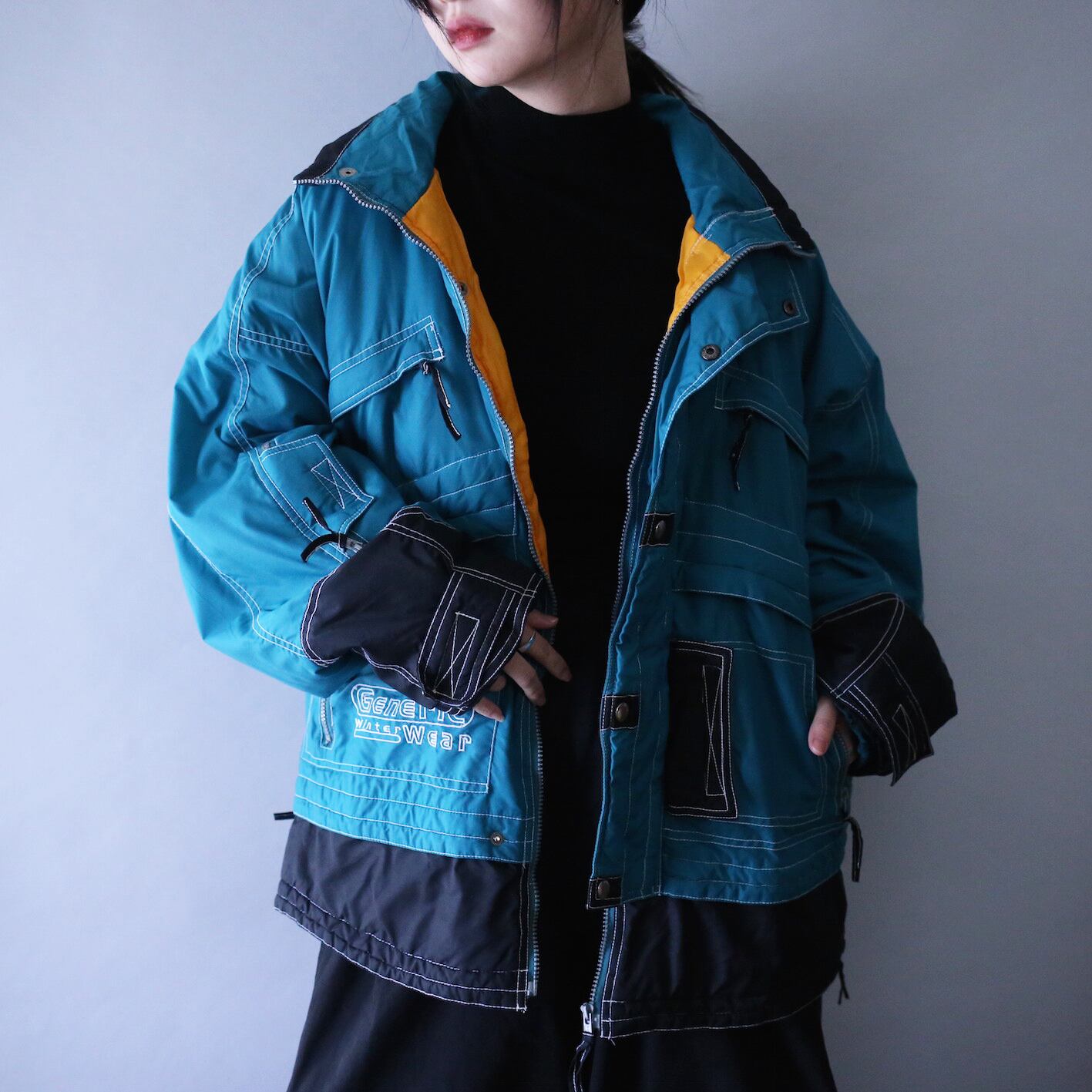美しい色味のターコイズブルー、随時に施されたステッチワークとジップ、ポケット等によるギミックでテック感を放つスペシャルジャケット