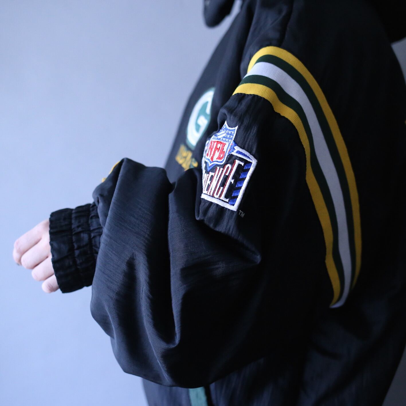両面共に左胸にはチームロゴワッペンをオン、左袖にはNFLのワッペンをオン、黒面の背中には"PACKERS"のワッペン、緑面にはチームロゴワッペンをオン、さらにさらに左袖と背中の襟下にはは"P"のワッペンを施し360度どこから見てもスペシャル感ダダ漏れ