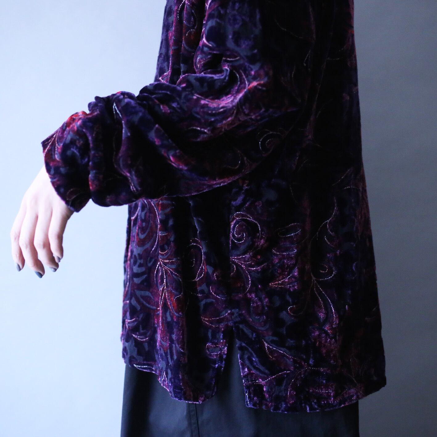 ボディ全体はレース生地のような薄らと透ける生地を使用、その上にベロア生地を乗せるような形で美しい柄を形成、ベロアが乗っている部分は透けず、それ以外が透けるなんとも絶妙〜な構造◎