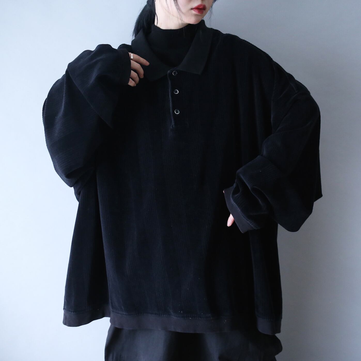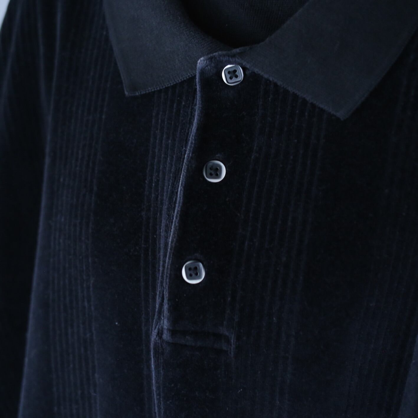 襟はポロシャツタイプの襟×ボタン付きの形になっており気の利いたアクセントをプラス、黒単色なので使い勝手も非常〜に良く合わせる色味を選ばずヘビロテ可能◎