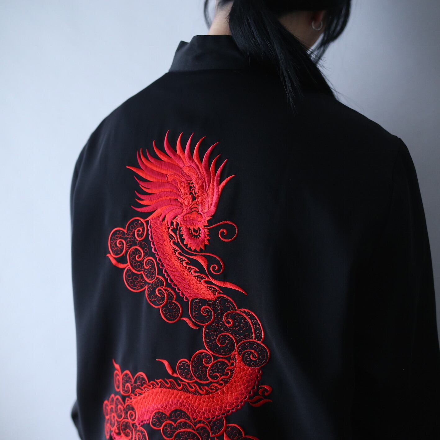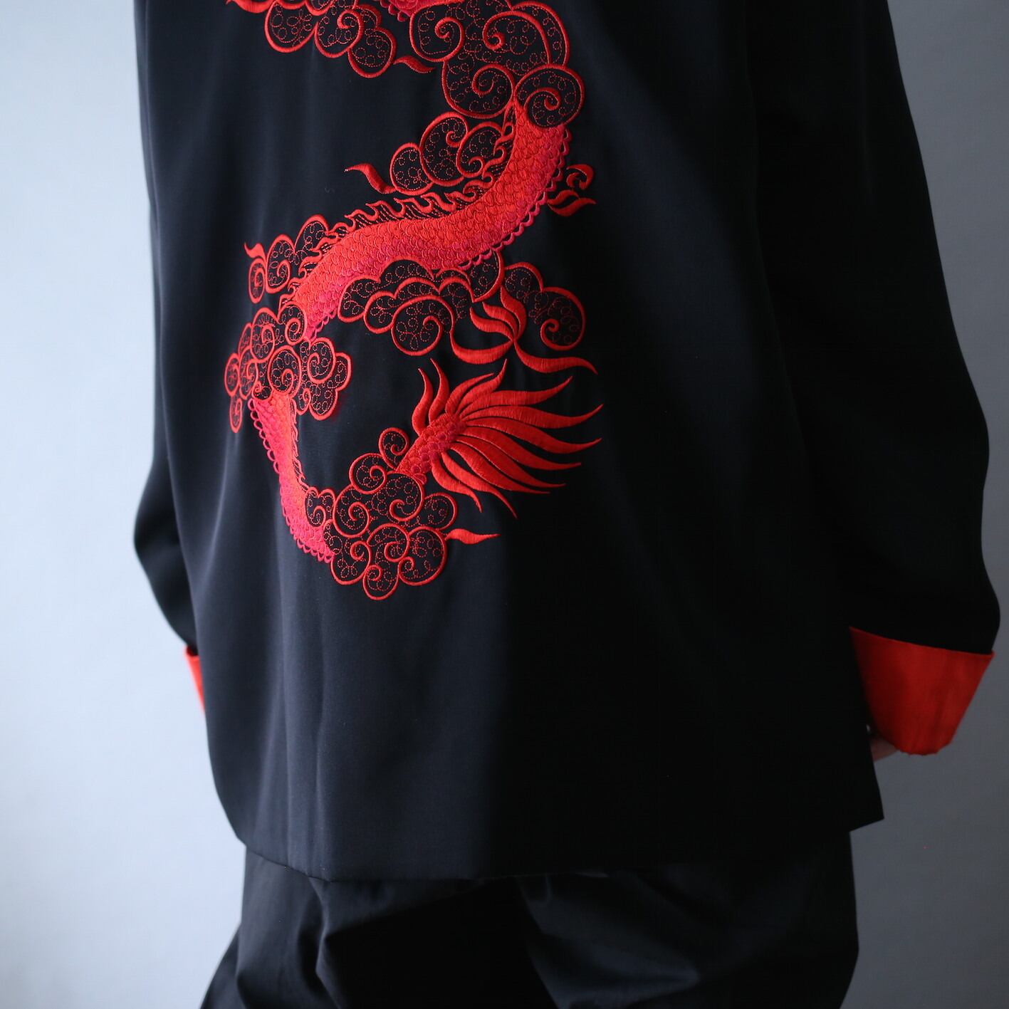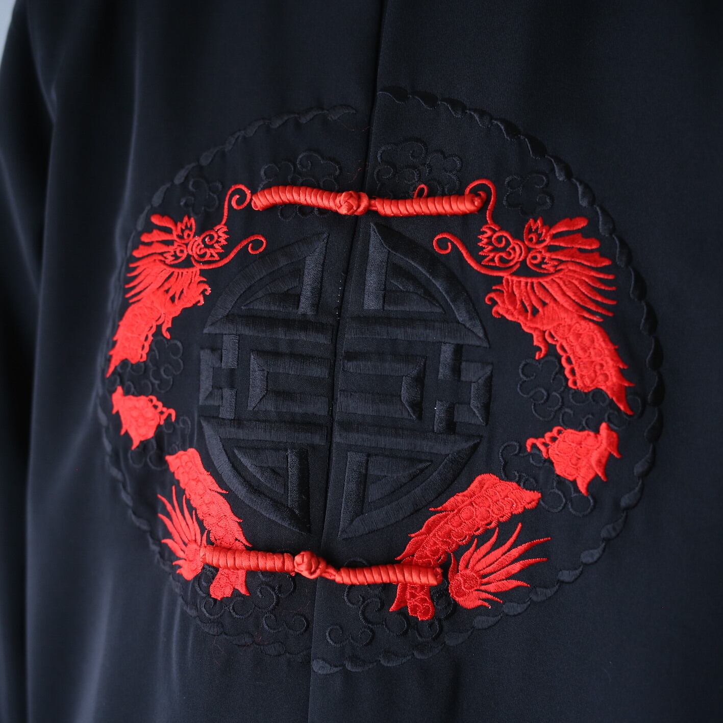 フロント中には2匹の龍と雲を大胆かつ繊細に刺繍でドン、鈍い艶感を帯びた黒ボディに凛として生えるグッドアクセント◎さらに背中には圧倒的な存在感を放つダイナミックな龍の刺繍をガツン、360度抜かりなしのチャイナシャツは探してもまぁ〜見つからない特級クラスのシロモノです