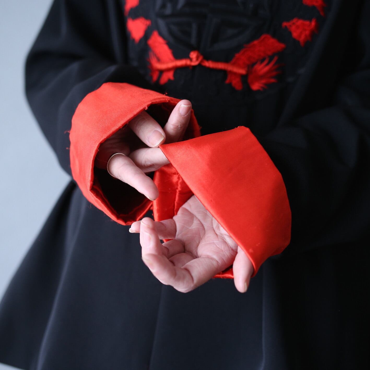 襟は立ち幅が低めで中央に隙間の空いたマオカラー、ボタンはグルグルと紐を棒状に丸めた先に輪っかと玉を組み合わせたチャイナボタン、袖口は開きっぱなしになった開放的な作りにサテン生地の切り替えを加えたチャイナ感剥き出しのデザイン、その全てが揃って完璧な一枚へと昇華