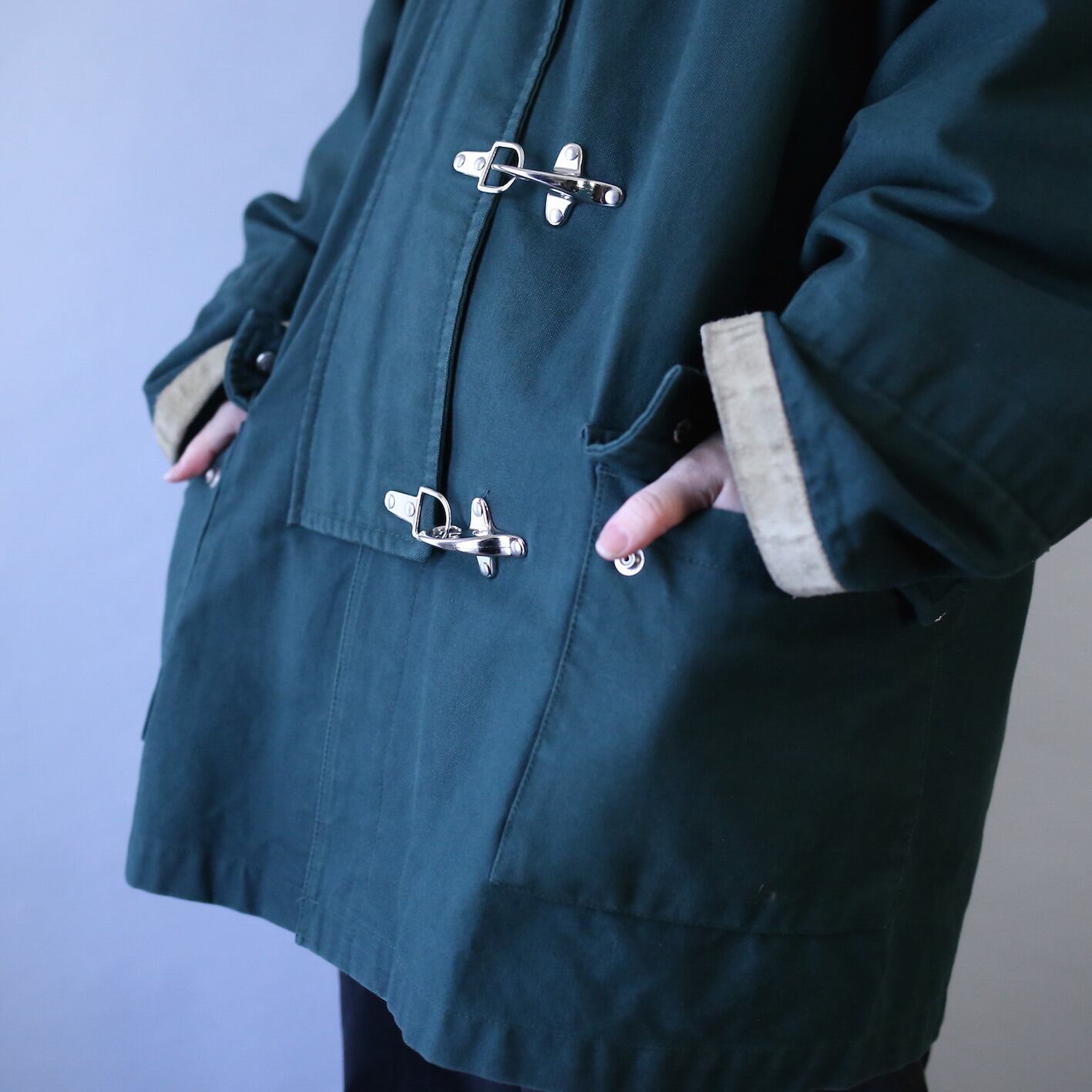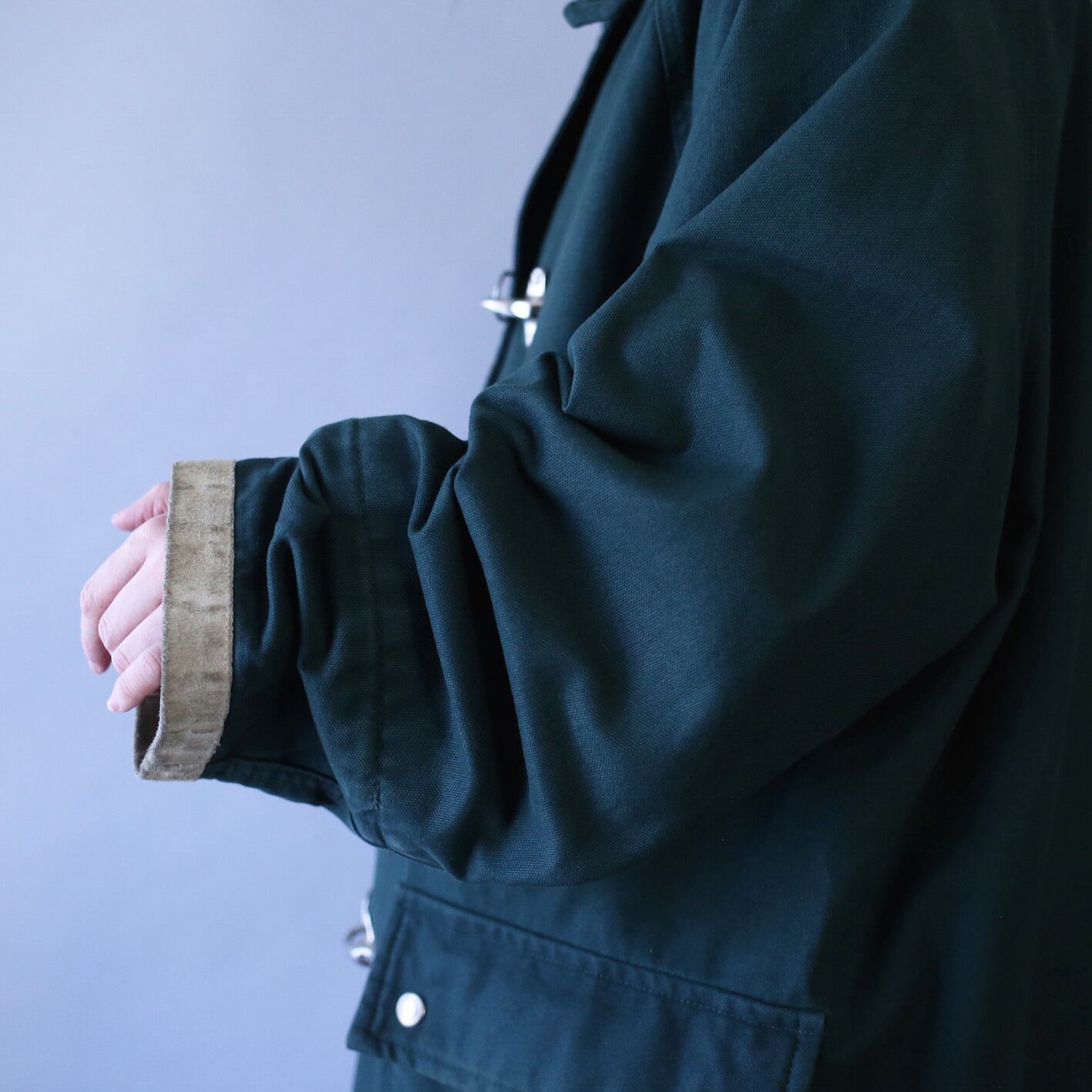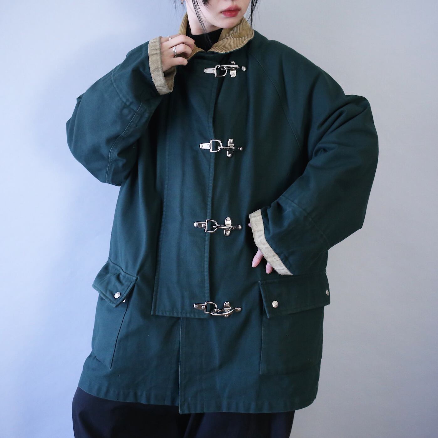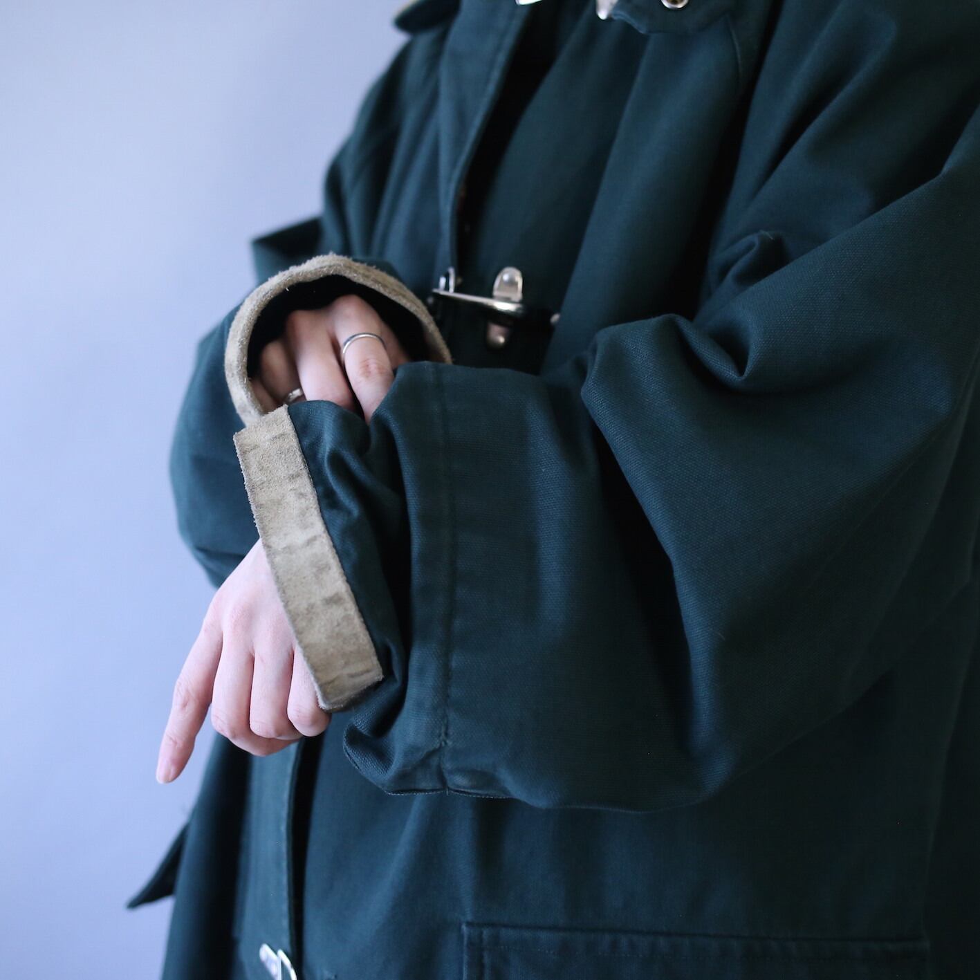深く美しいディープグリーン、襟はコードゥロイ、袖口はスエードの切り替え、大ぶりなポケットに加えてフロントの金具がアクセント、取り外し可能なチェック柄ライナーが付いた極上ファイヤーマンジャケットの登場です✌︎