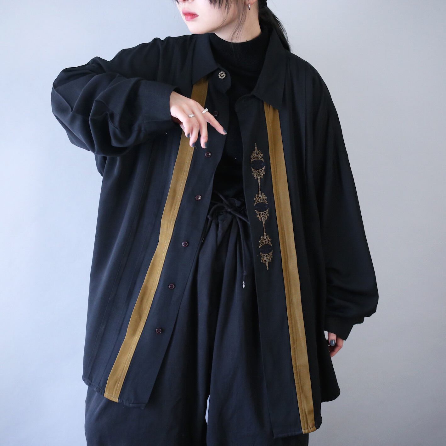 ボタンを閉めて十分様になりますし、オーバーサイズを活かした羽織りスタイルもオススメ◎コートなどの綺麗目なアウターにレイヤードして刺繍をチラ見せしてもコーデの格をグッと高めてくれる素晴らしい一枚だと思います〜