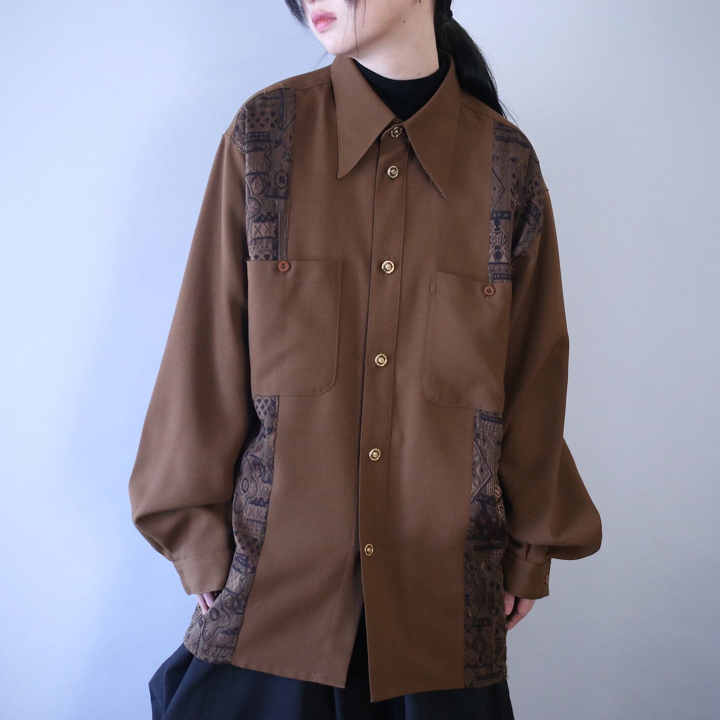 この服のミソとなる両サイドに施された織柄、壁画のような幾何学模様が古着らしい"唯一無二感"を放つと共に、織りの糸が光沢感を放ちラグジュアリーモードな装いに◎