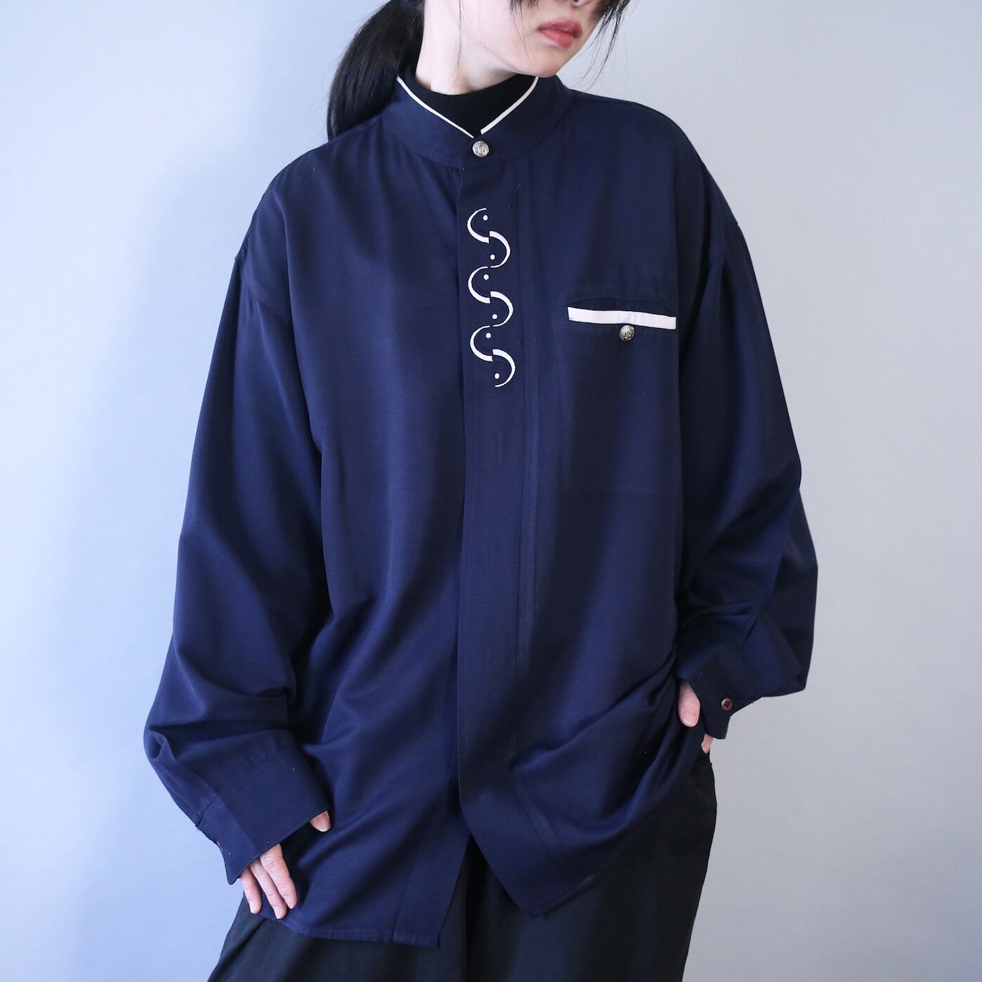 襟はスタイリッシュなバンドカラー、中央には細かい彫り込みを加えたシルバーボタンをオン、襟を縁取るようにさりげなく入る白ラインもアクセントとして◎