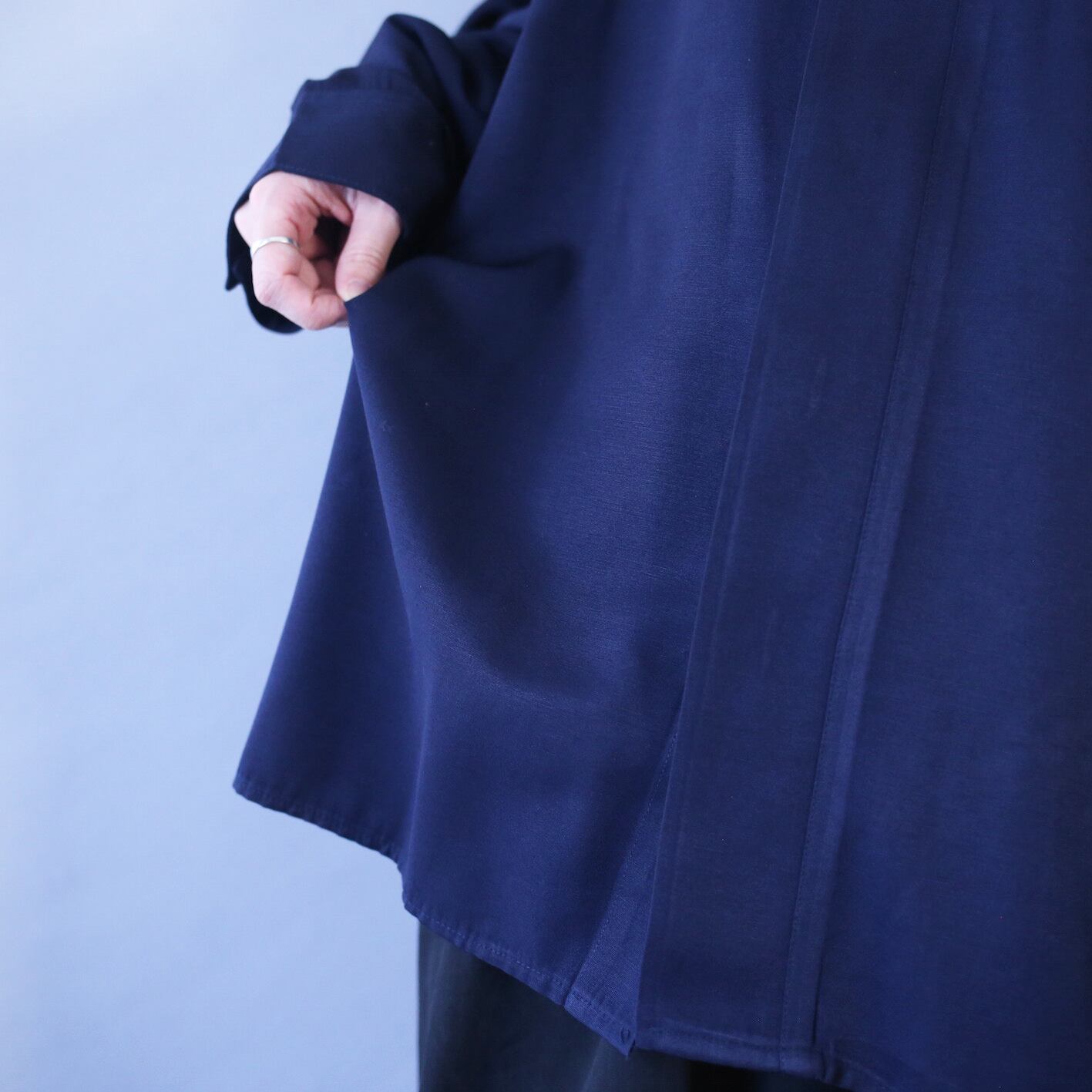 カラーは深海に潜り込んだようなディープネイビー、ポリエステル×レーヨンの上質な生地感から放たれる鈍い光沢感も相まってラグジュアリーモードな装いに◎
