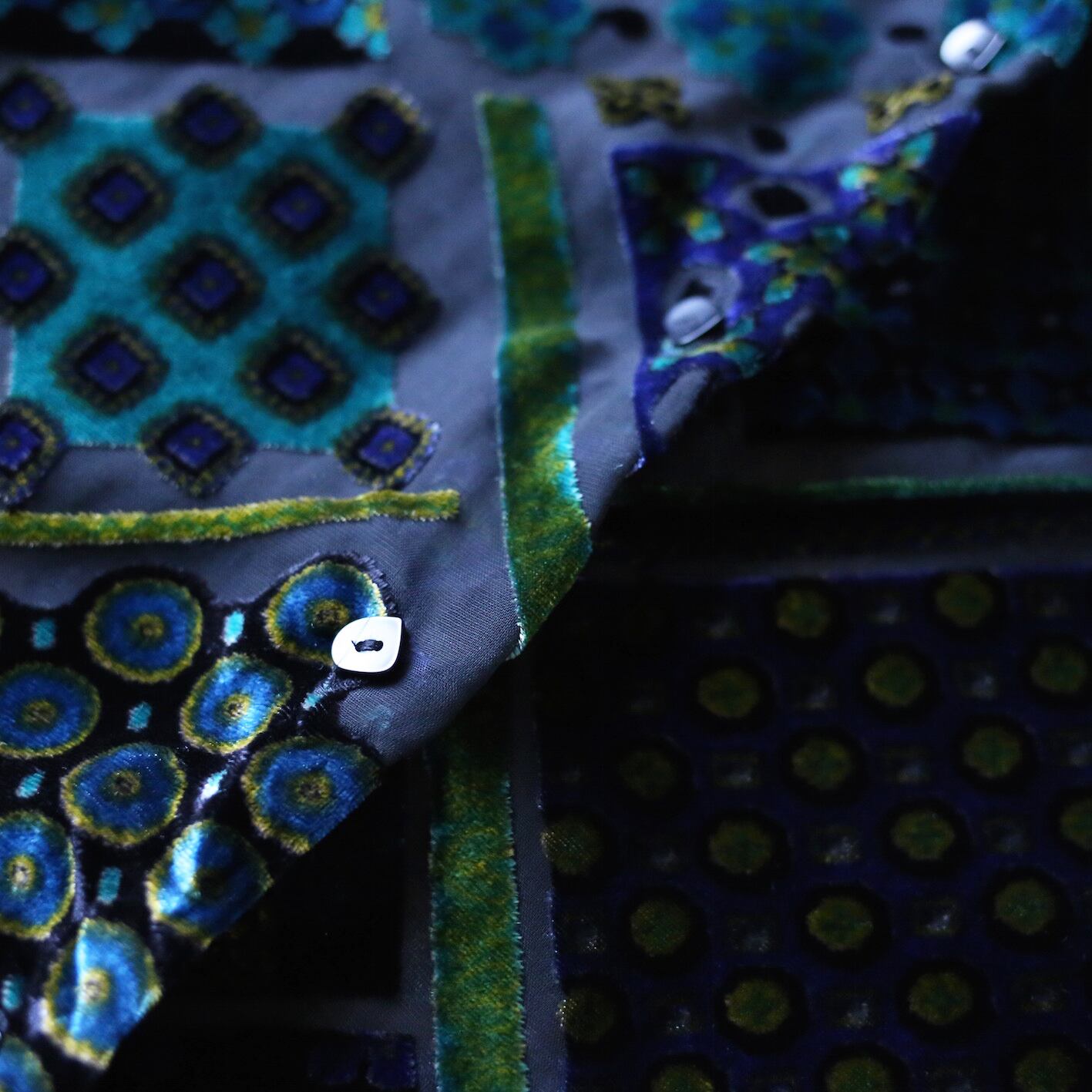 "孔雀"を彷彿とさせる美しいグラデーションと禍々しい柄、ベロアの中でも一際ラグジュアリーな世界観を放つシースルーシャツの登場です