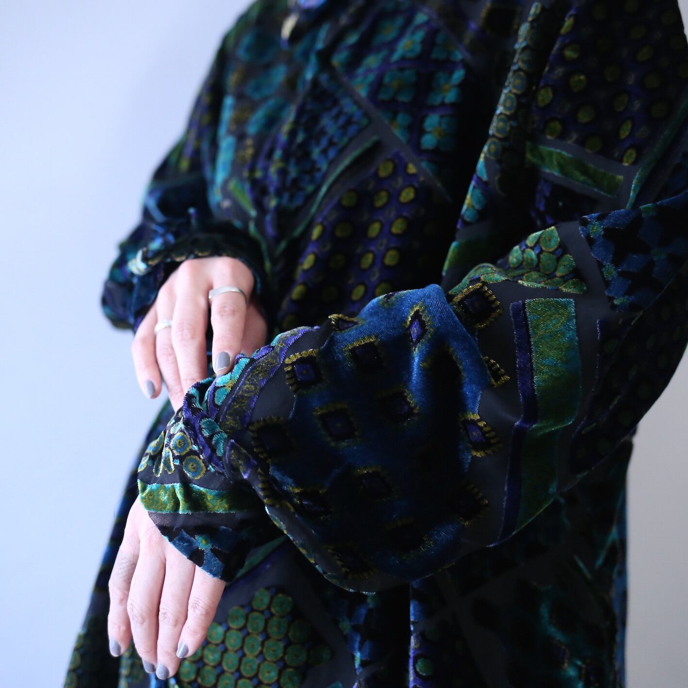 カラーは緑や青といった幻想的な色を軸に黄金色を混ぜ込んだ奇才感溢れる仕上がり、ベロア特有の鈍い艶感が光の当たり具合によって濃淡が生まれ、見る角度によって表情を変わる高級感たっぷりの仕上がり◎