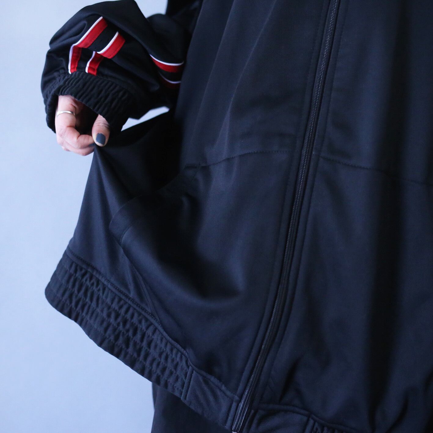 黒ボディに赤と白のラインを加えた超〜良配色、加えてジャージ生地特有の艶やかな質感が服全体にレザーのような重厚さを与え高級感をググッとアップ