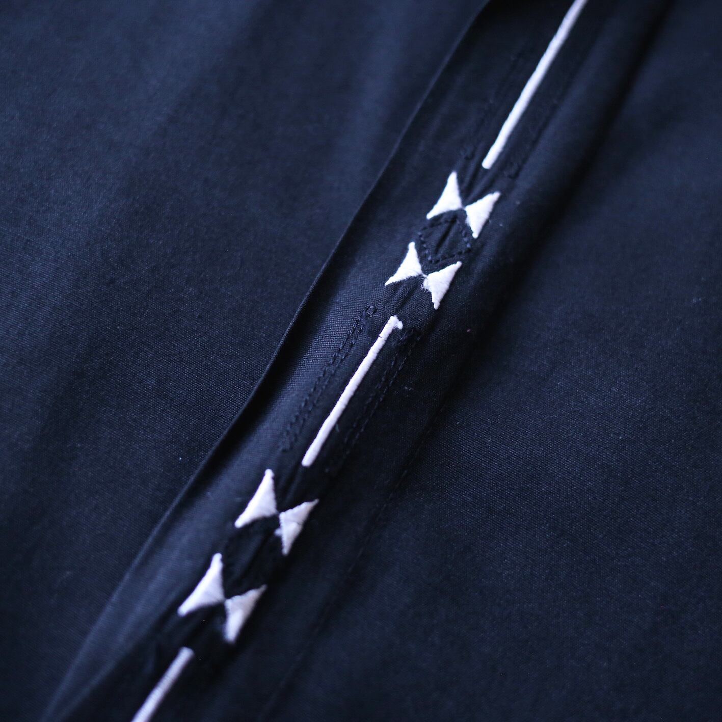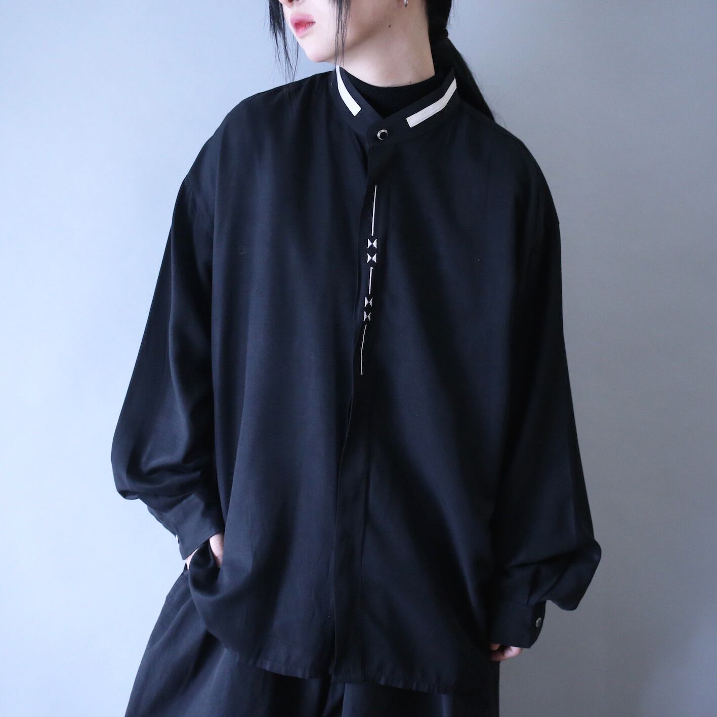 "刺繍" black×white design fry-front band-collar minimal mode shirt