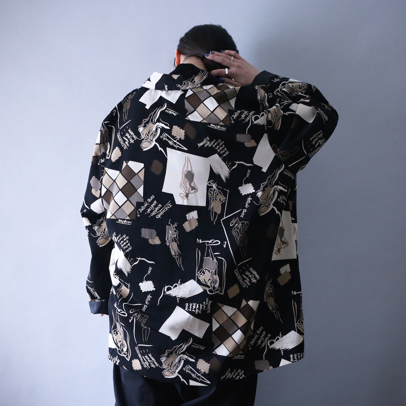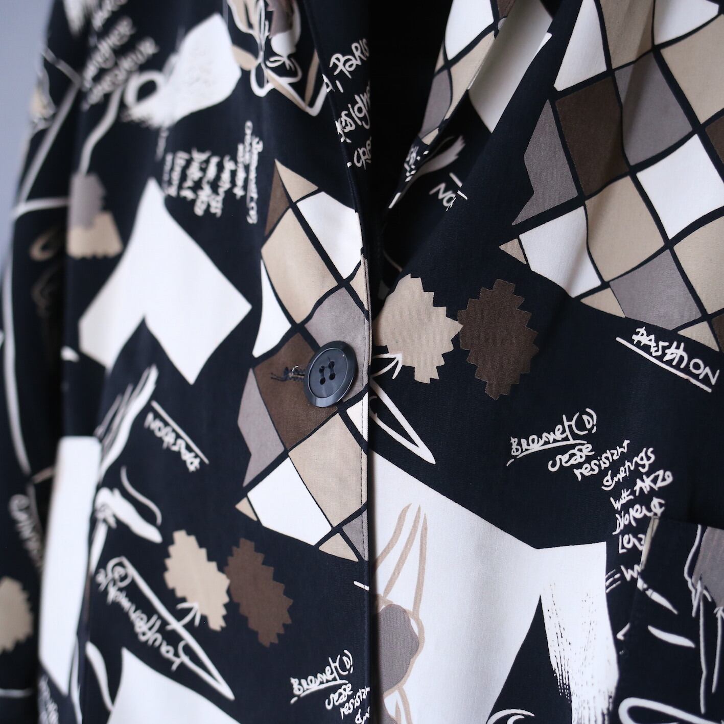 全体に散らされた柄は造形的な幾何学柄を中心に随所でパリのお洒落な女性を彷彿とさせるアートスティックなイラストをオン、これ一枚羽織るだけでコーデの格がグッド高まるかと思います◎