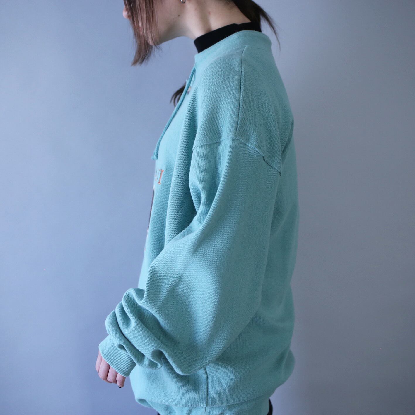 中央にはデカ刺繍、襟は真ん中にスペースを開けつつボタンを2個添えたヘンリーネック、服全体は美しいティファニーブルーに包まれたオーバーサイズプルオーバーの入荷です✌︎