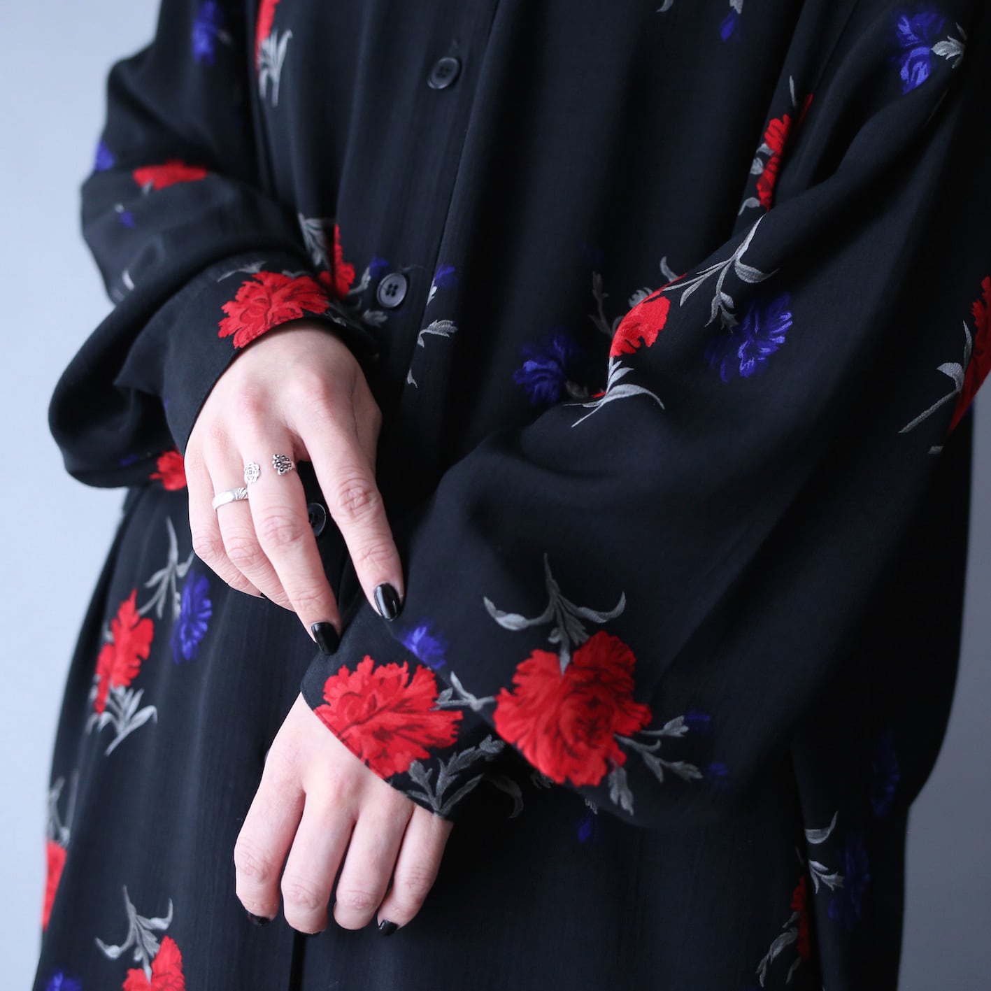 黒地に大判且つ繊細なタッチで描かれた薔薇を服全体に満遍なく施した当店十八番のモード映えデザインシャツの登場です