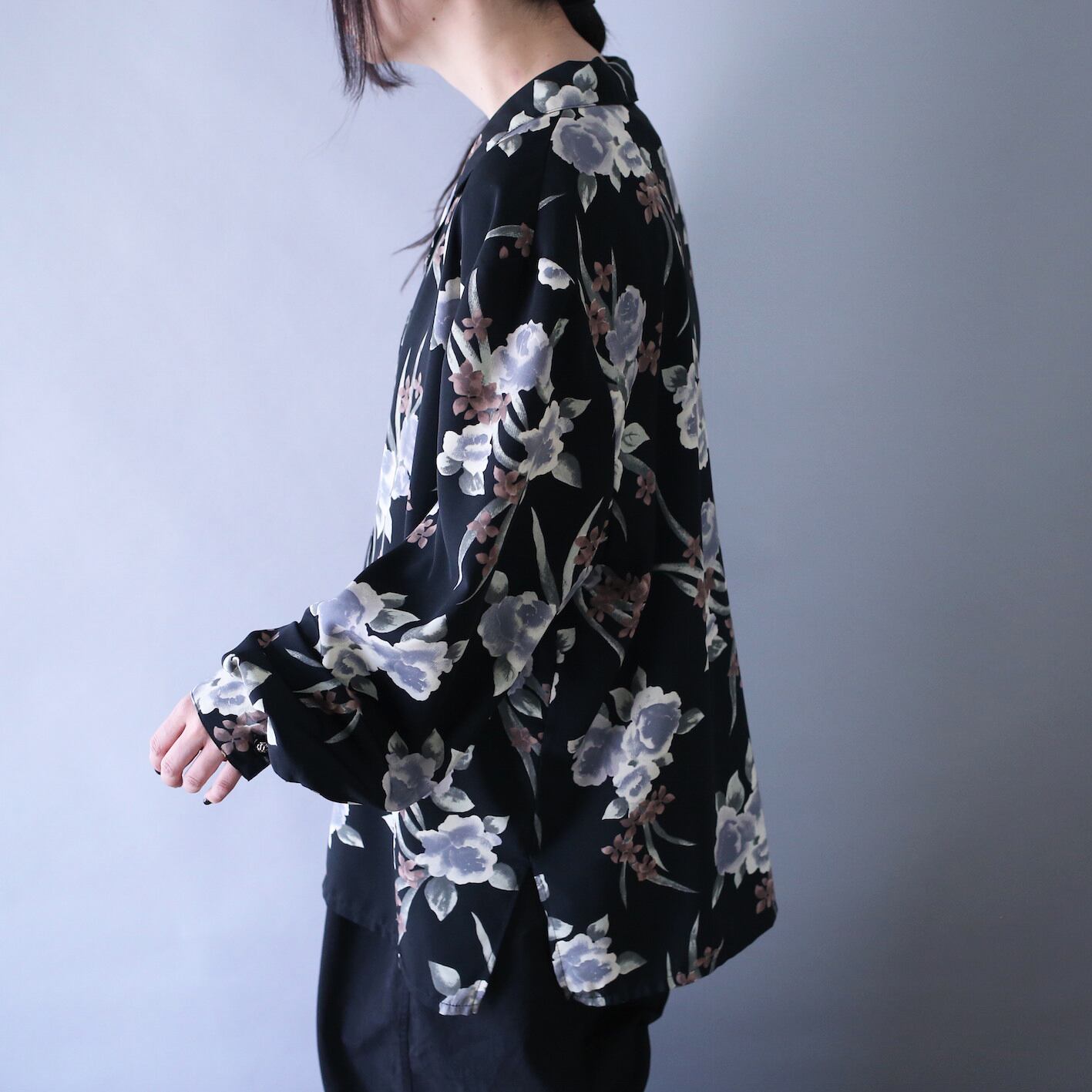 ポリエステルの砂浜のようなざらついた光沢感に色素薄めの儚げな薔薇が大胆に散りばめられたモードシャツ。