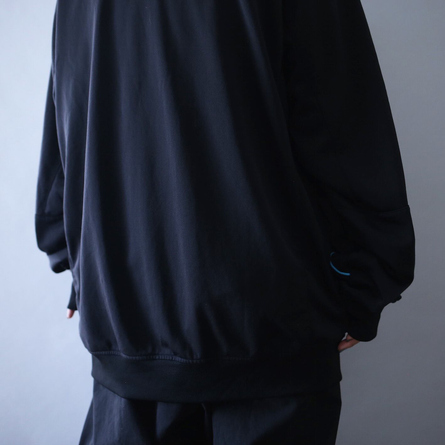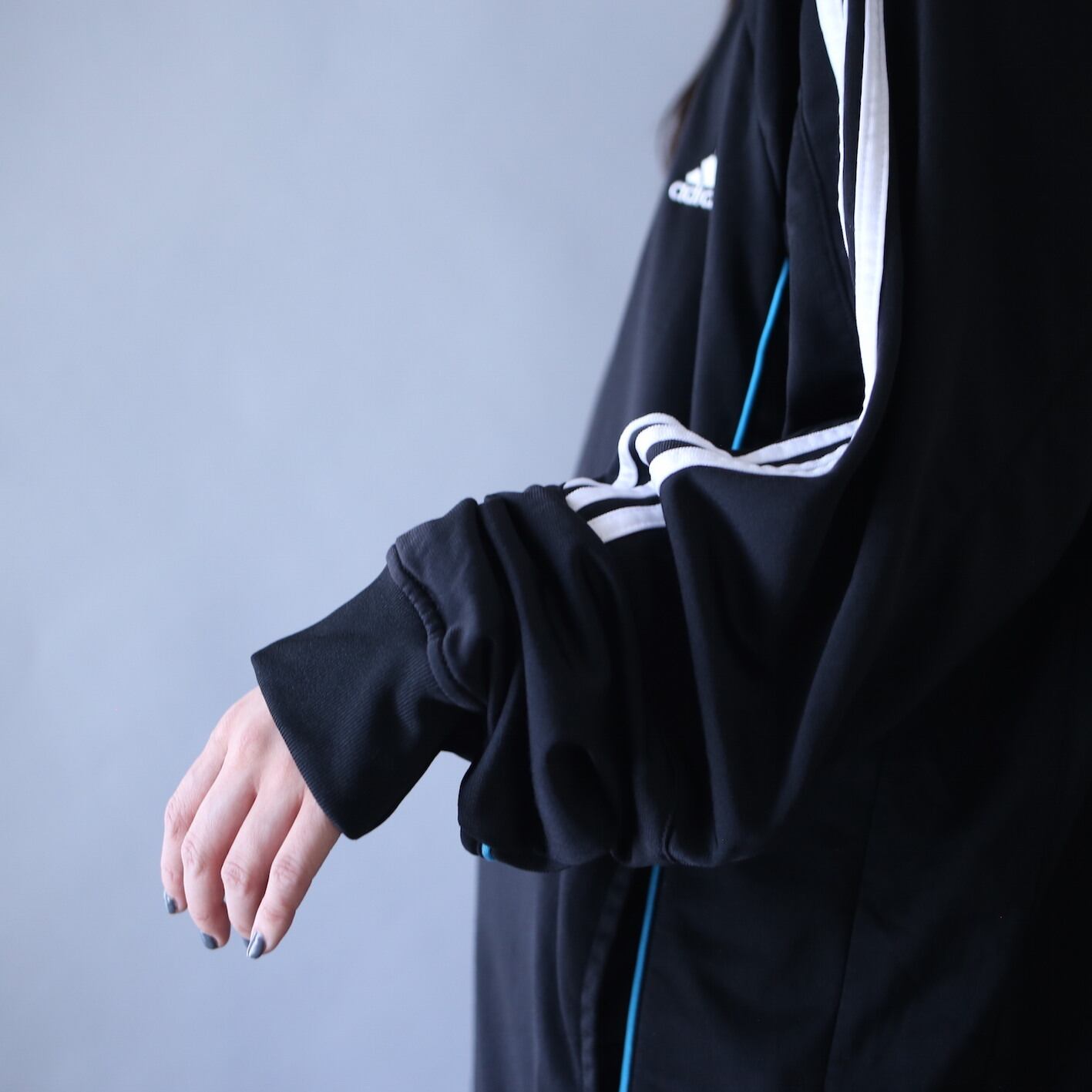 アディダスのトラックジャケットというと多くの方が想像するのが黒地に白のスリーラインが施されたものだと思います、コチラはそこに"水色"のパイピングで"唯一無二"なフレーバーを与えた稀有なシロモノ