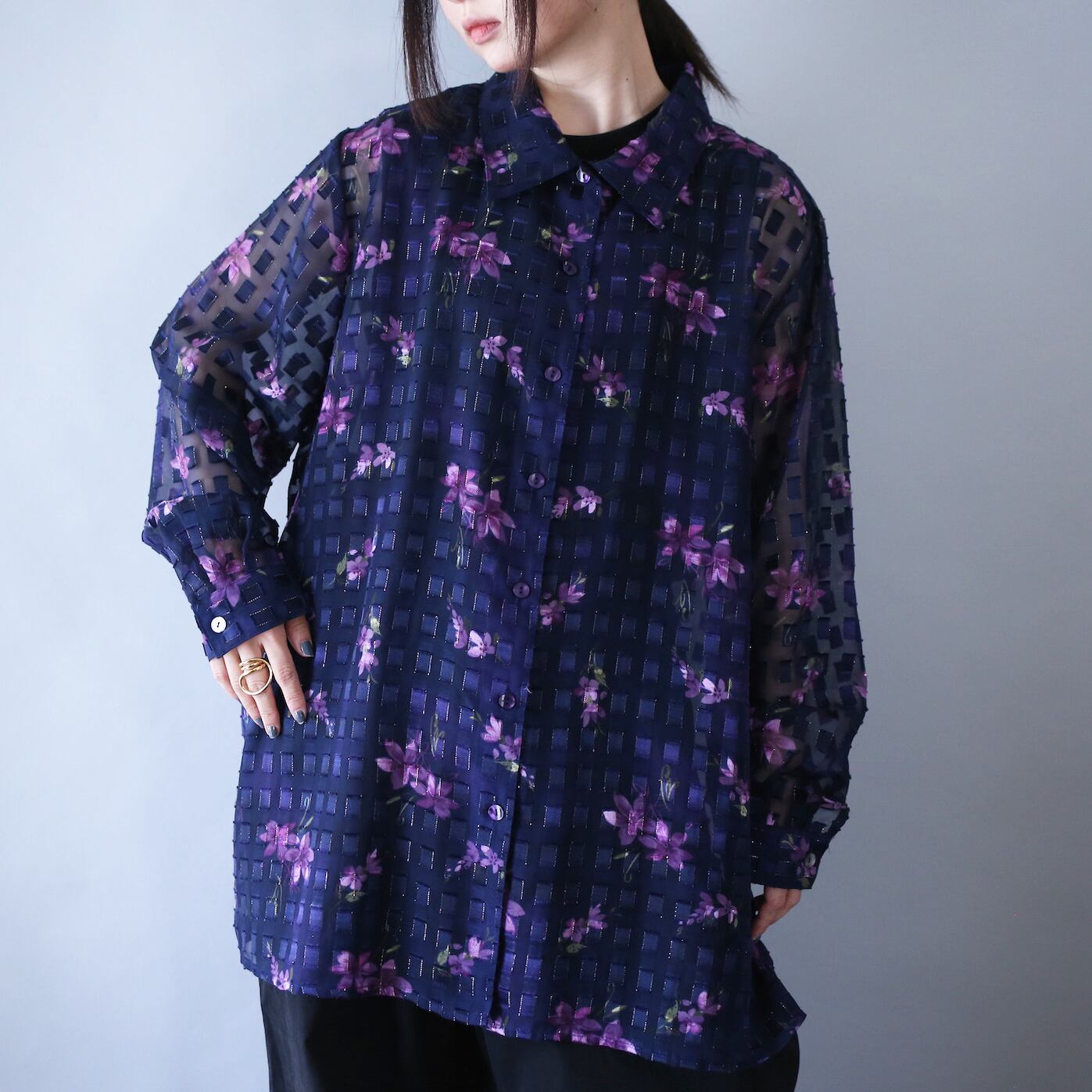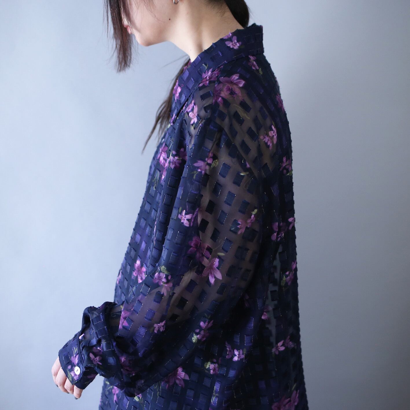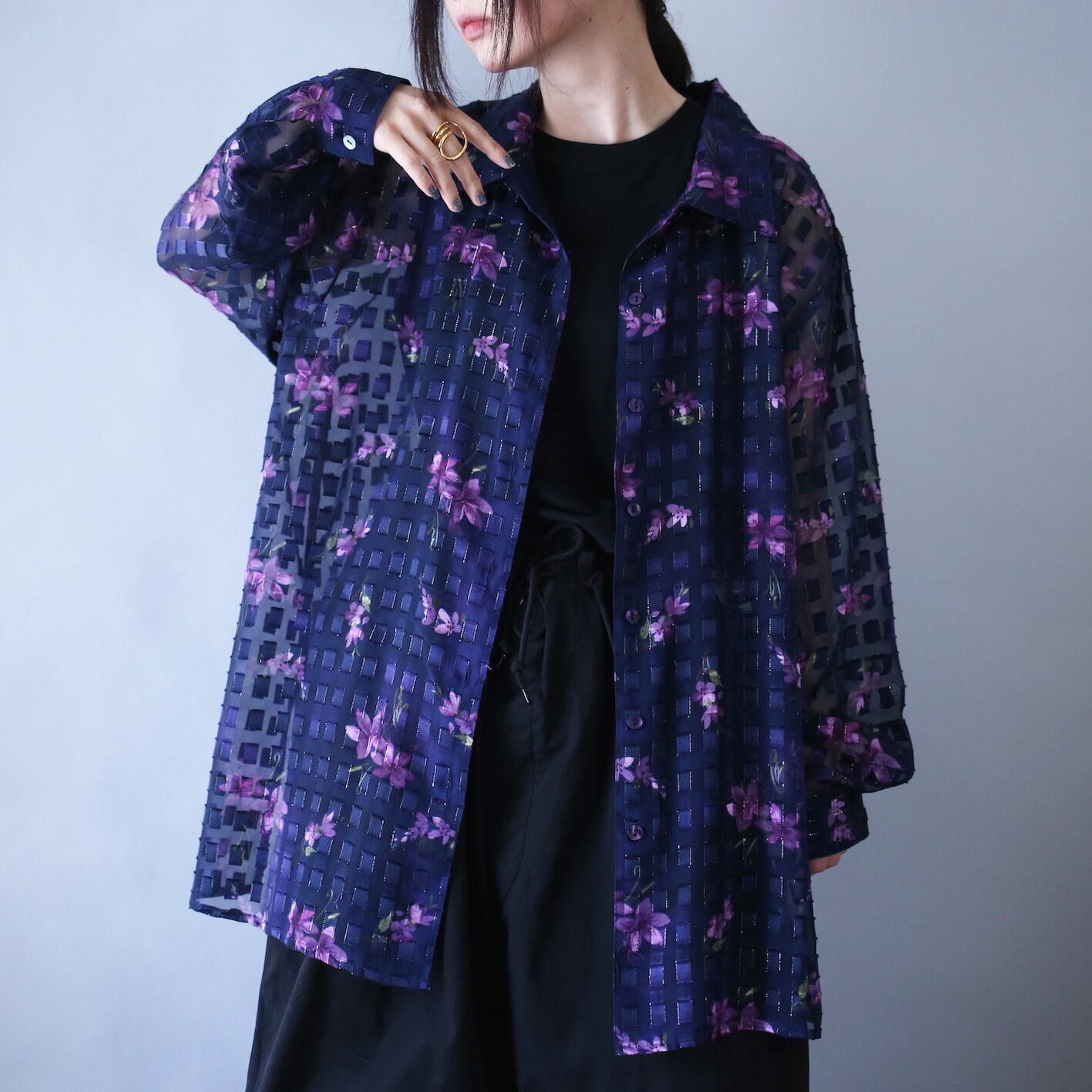 加えて服全体にはお花をモチーフとしたアート感溢れる柄を満遍なくオン、シースルーとの相性が良いラグジュアリーな世界観を一気に構築、モード好きにはたまらない仕上がりかと◎