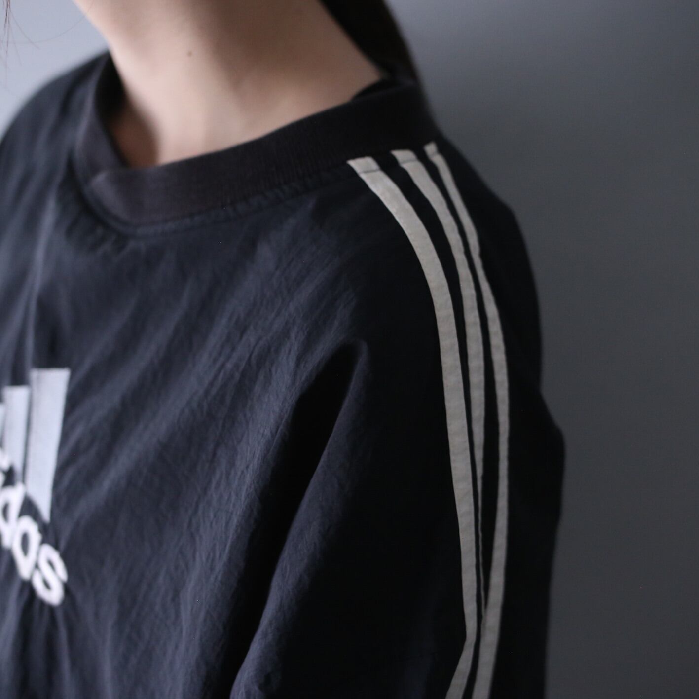 フロントのパフォーマンスロゴはデカサイズとなっており存在感バツグン、1枚でも充分サマになります。袖にはこれがないと始まらないといった鉄板無敵ラインのスリーストライプスがもちろん入っております。