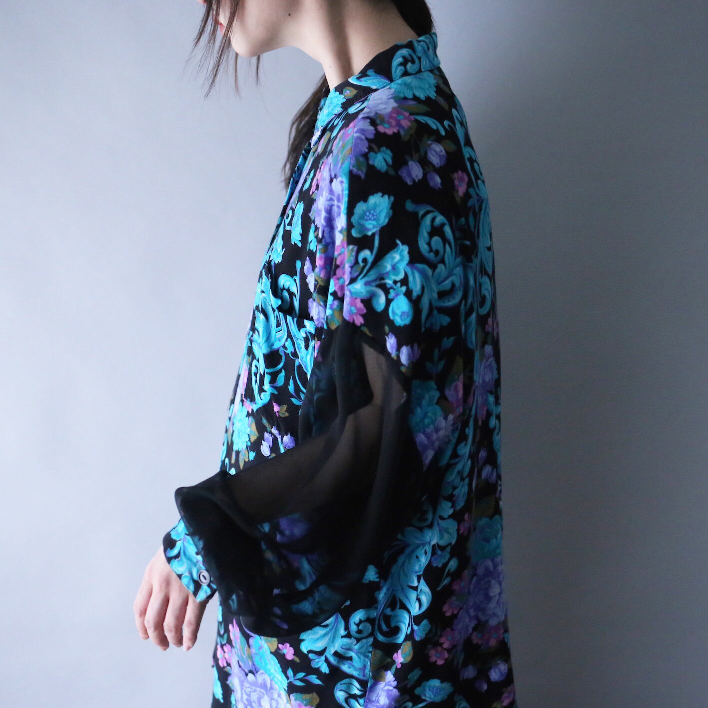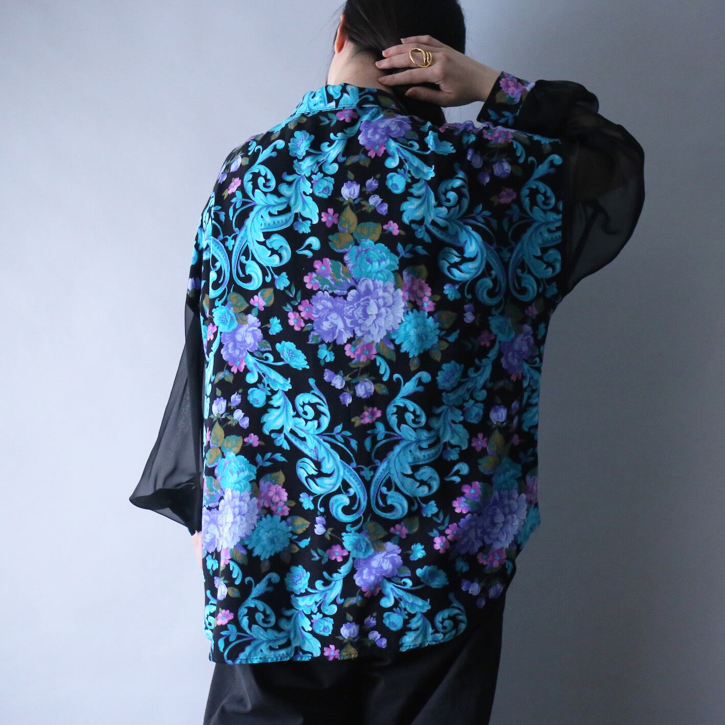 当店で強い人気を誇るブラックベースの花柄シャツより、袖だけシアー素材という超絶スペシャルな1着をご紹介。