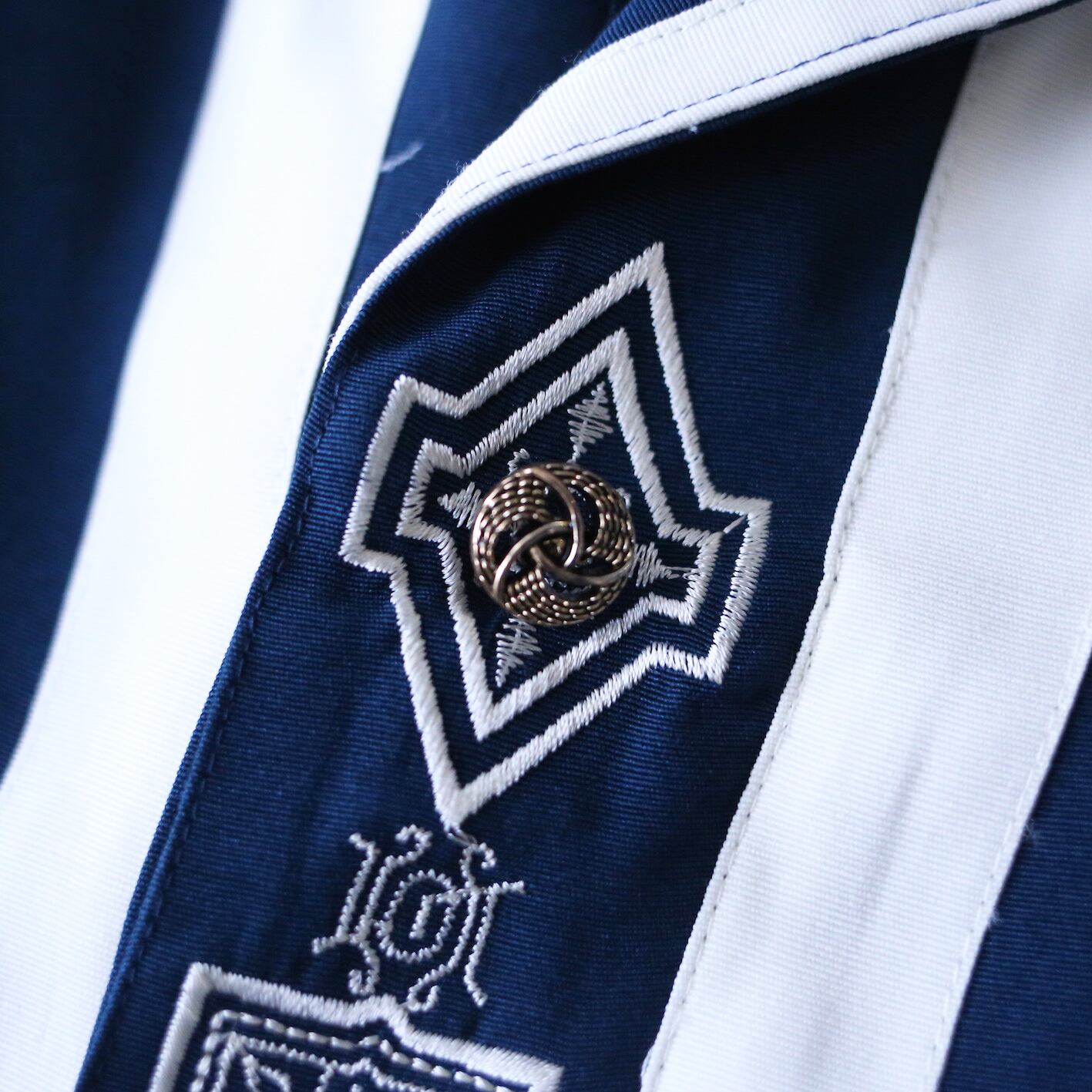 比翼と左胸のポケットには大ぶりなゴールドの細工ボタンを贅沢に使用しておりこのボタン一つとってもかな〜り高価なモノ、加えて比翼には幾何学的且つアーティスティックな刺繍を繊細にドン、刺繍特有の立体的な艶感が高級感をグーっと底上げ◎