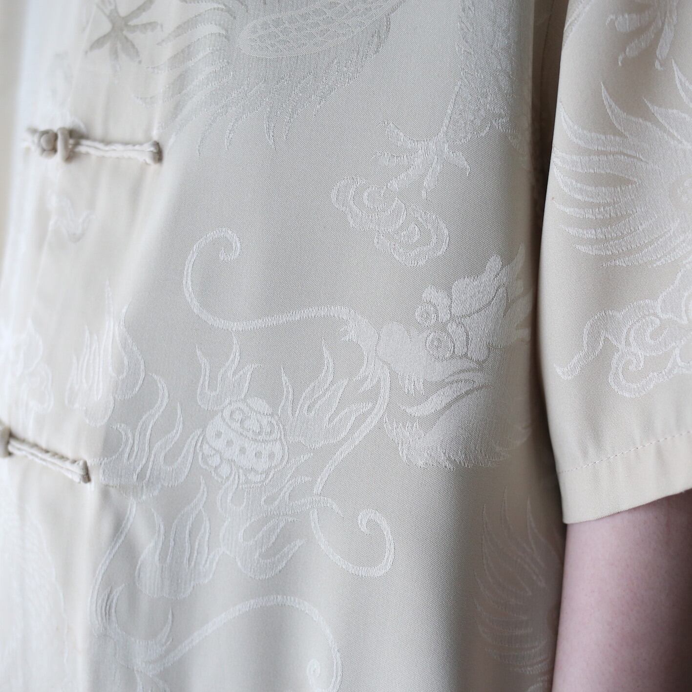 チャイナシャツといえばマオカラーとチャイナボタンがトレードマークですが後ろから見るとなんの変哲もないただのシャツ、、、となりがちですが心配ご無用、マットなベージュベースに光沢のある龍刺繍が全面に施されており、360°チャイナ文化をビシビシと感じることができます。