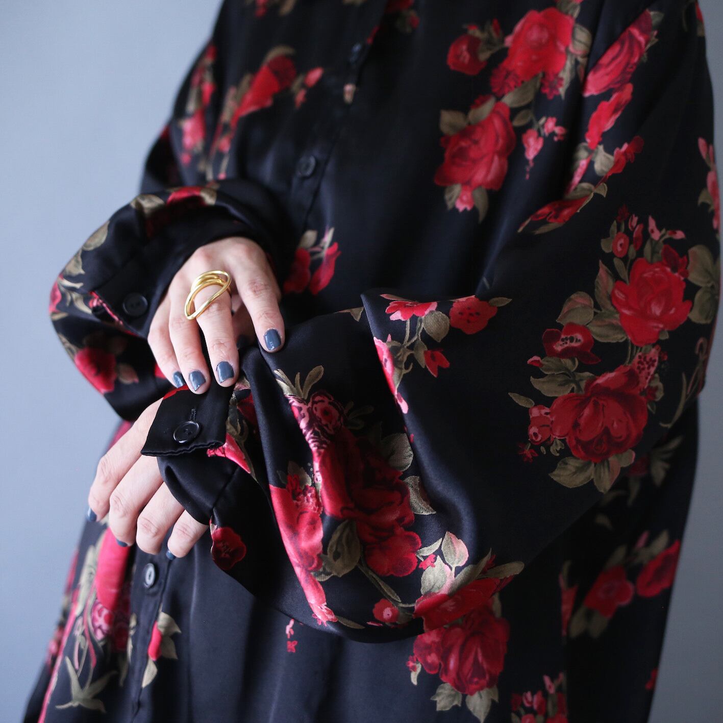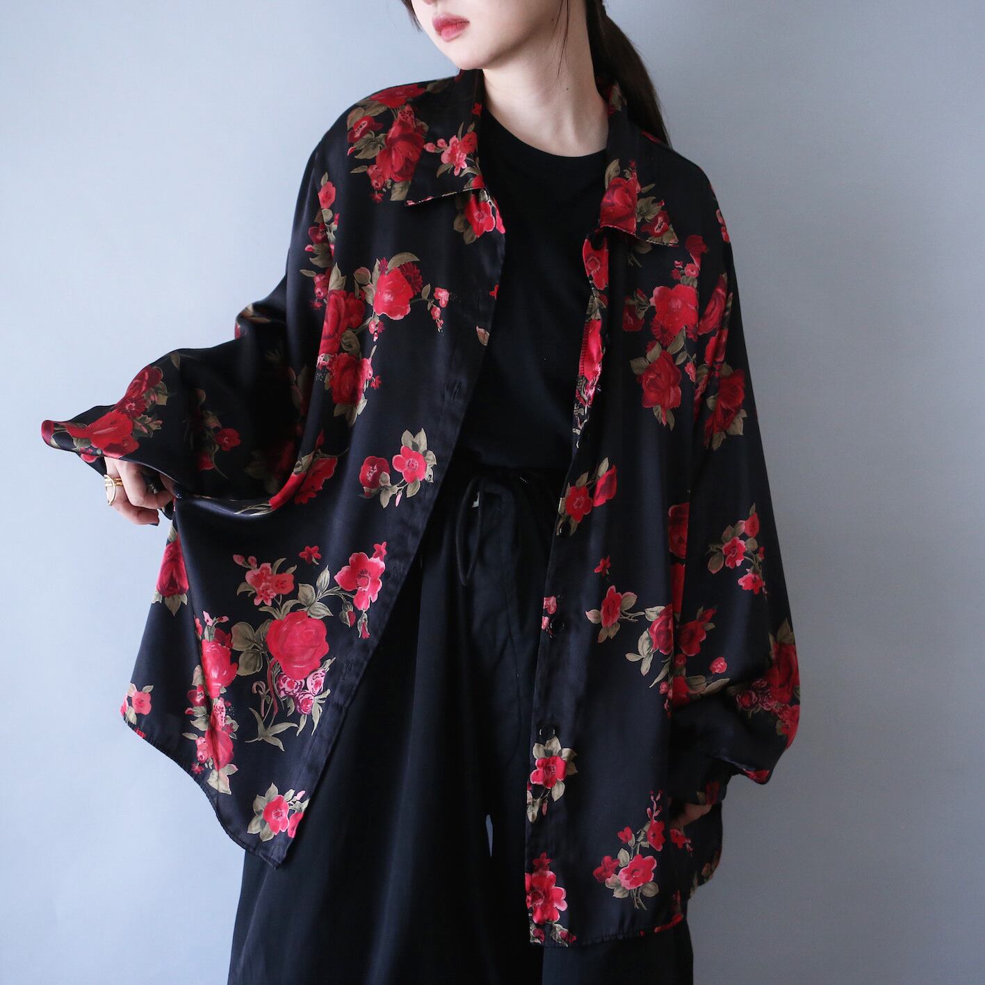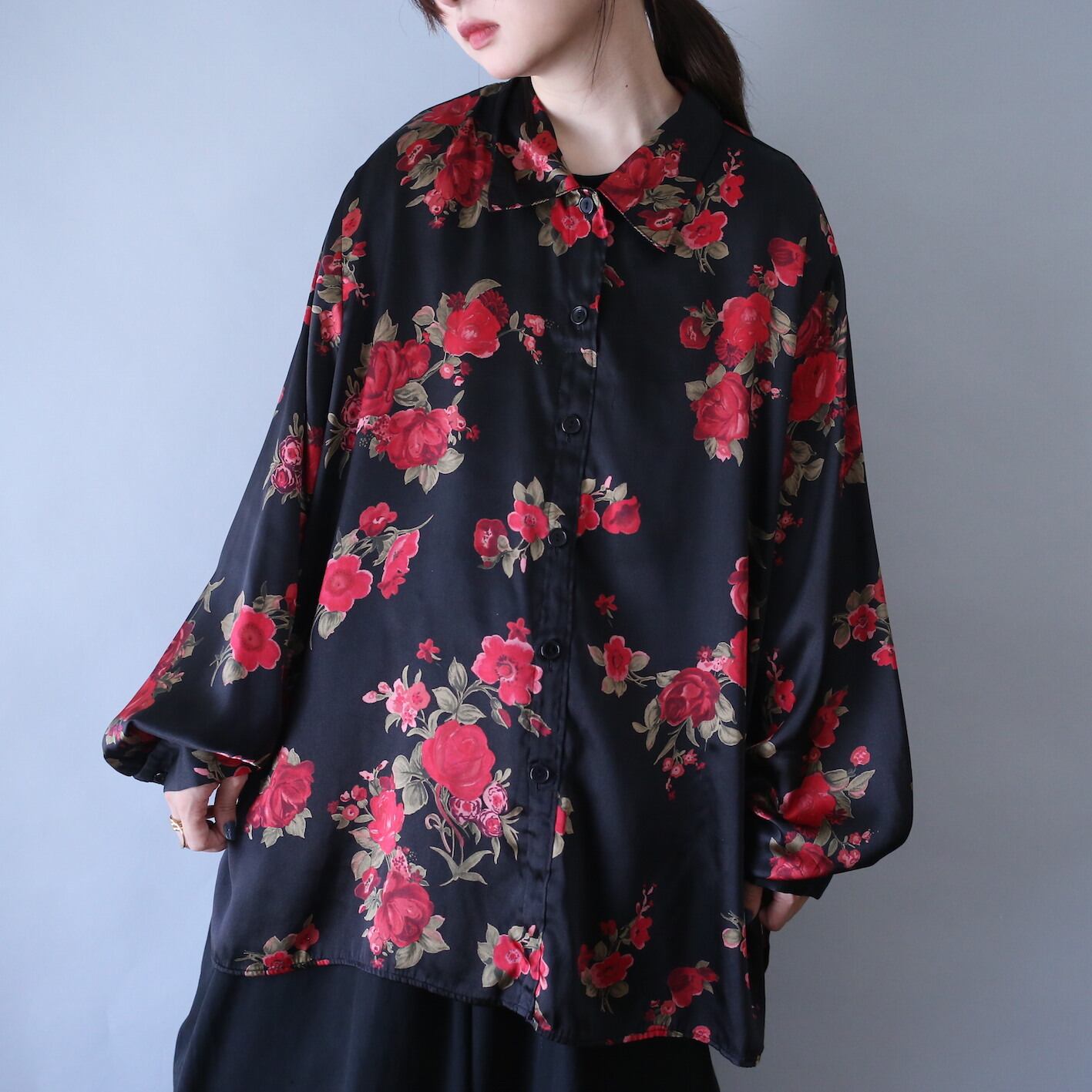 サテンの艶々光沢生地に大判な赤い薔薇が散りばめられた古着では非常〜に稀有なラグジュアリー感を放つ極上モード花柄シャツのご登場。