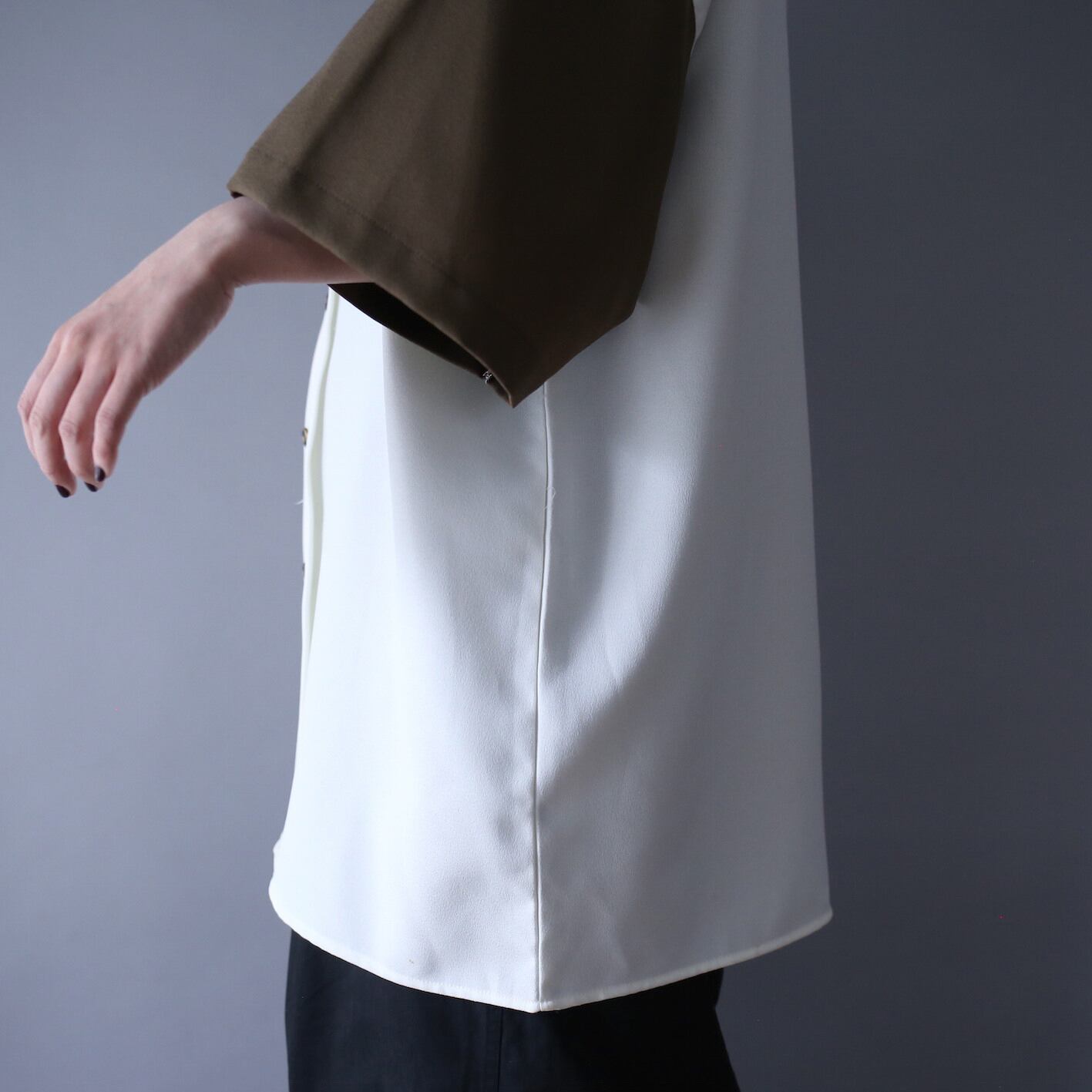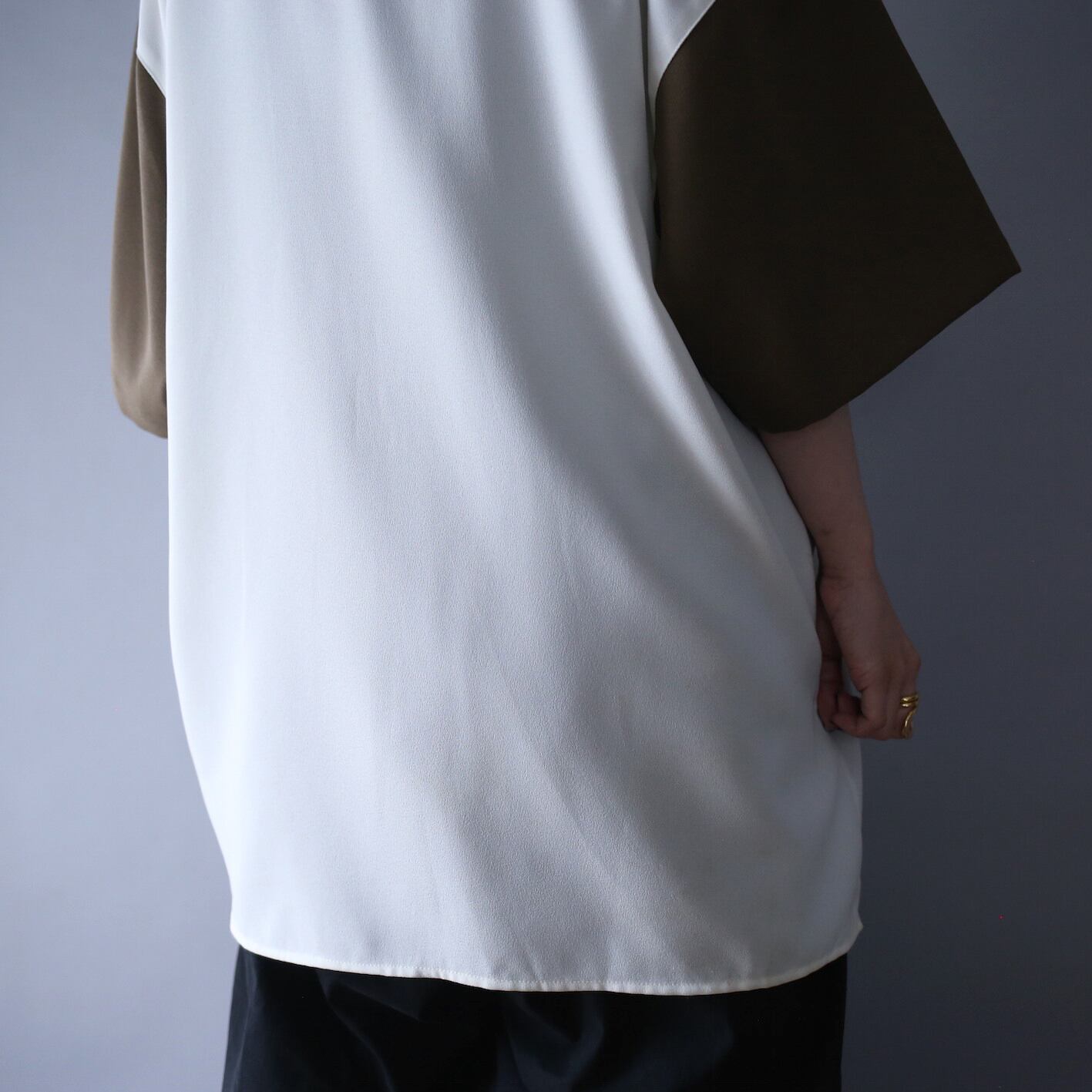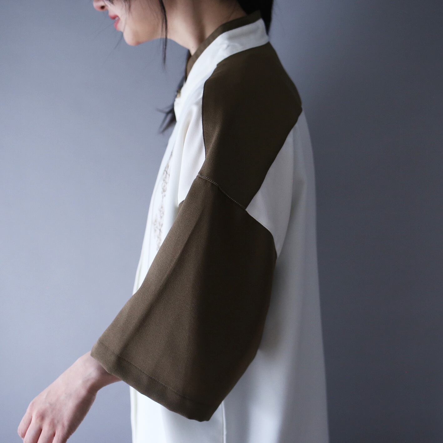 ボディはクリームがかったベージュと人気の高いくすみカラーを採用、袖と襟には切り替えでブラウンが使われておりなんともモダンな配色が唯一無二感を加速。