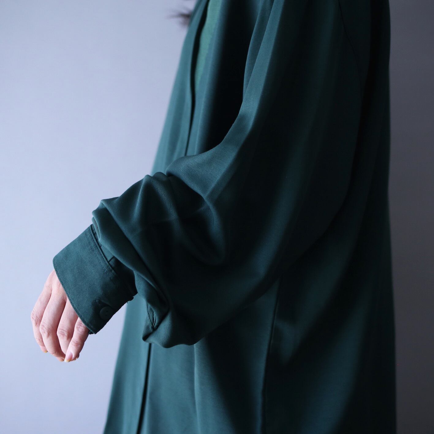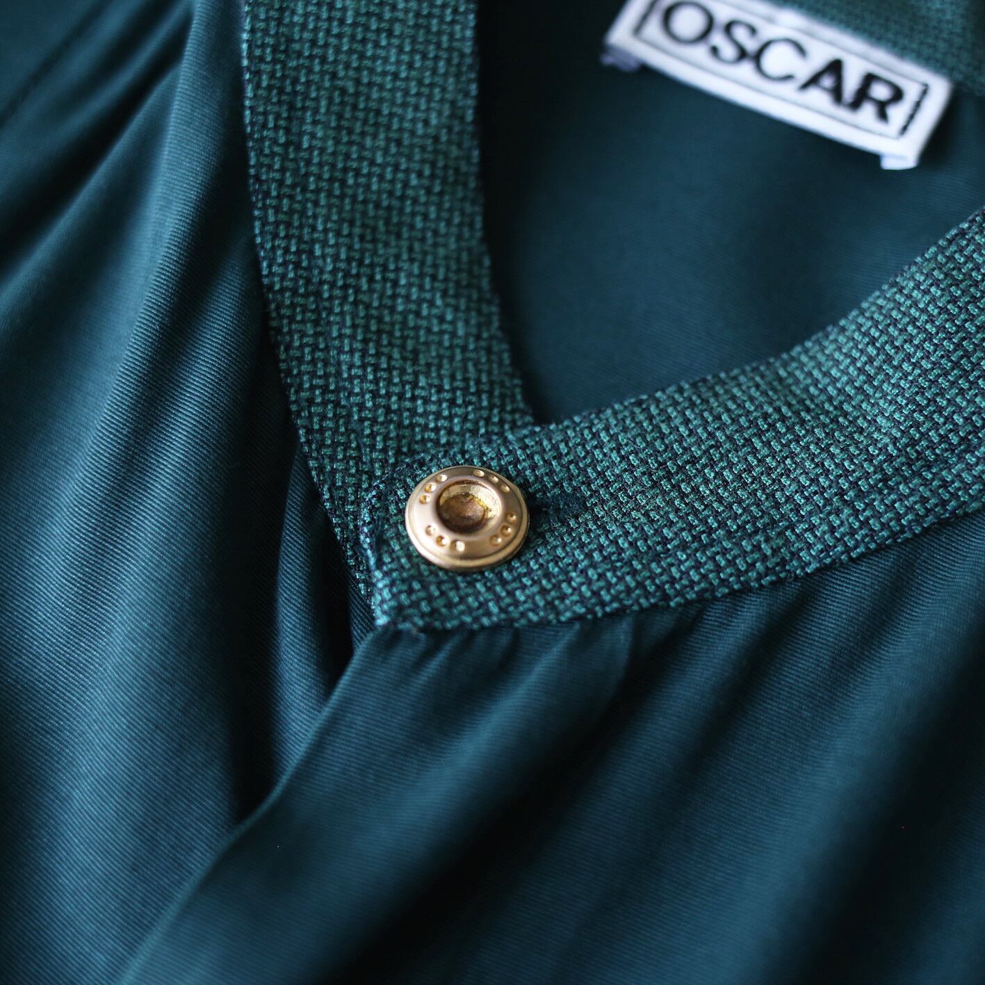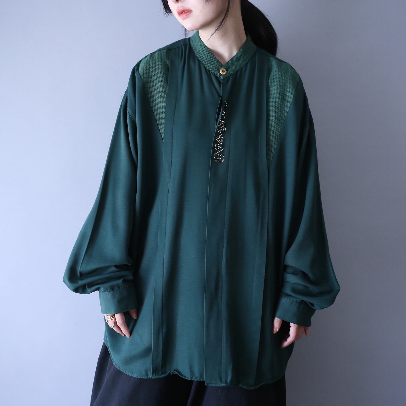 近年人気の高まっているトレンドカラー‘‘グリーン‘‘をボディにはフロントはボタン部分を前立てで覆った比翼仕立て、そして上にはキラキラと輝くビーズをくねらせながらオン。定番のブラックではなくダークグリーンという映えカラーから滲み出る"唯一無二感"に痺れます。