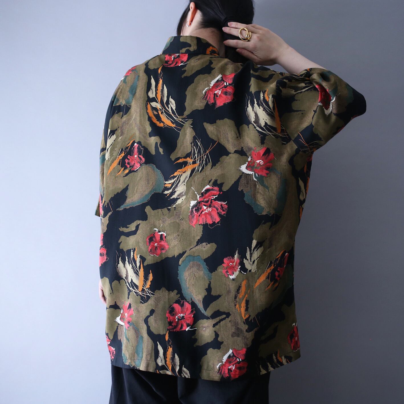 常に人気ドコロである古着といえばの‘‘総柄シャツ‘‘、その中でも人気の高い抽象柄と花柄の双方掛け合わせて作られダーク感ムンムンな逸品の登場です。