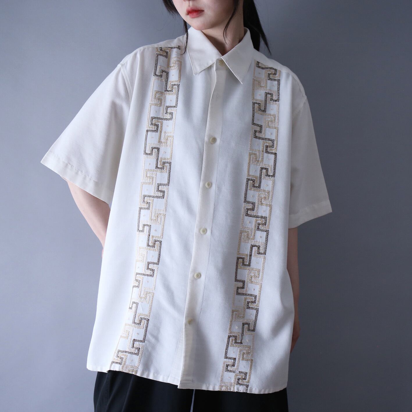 ほんのりとくすみがかったアイボリーに幾何学的なラインをシンメトリーに入れ、身幅広め&袖長めでサイズ感バツグンの半袖シャツ。