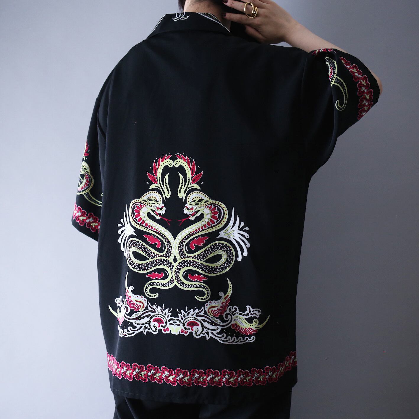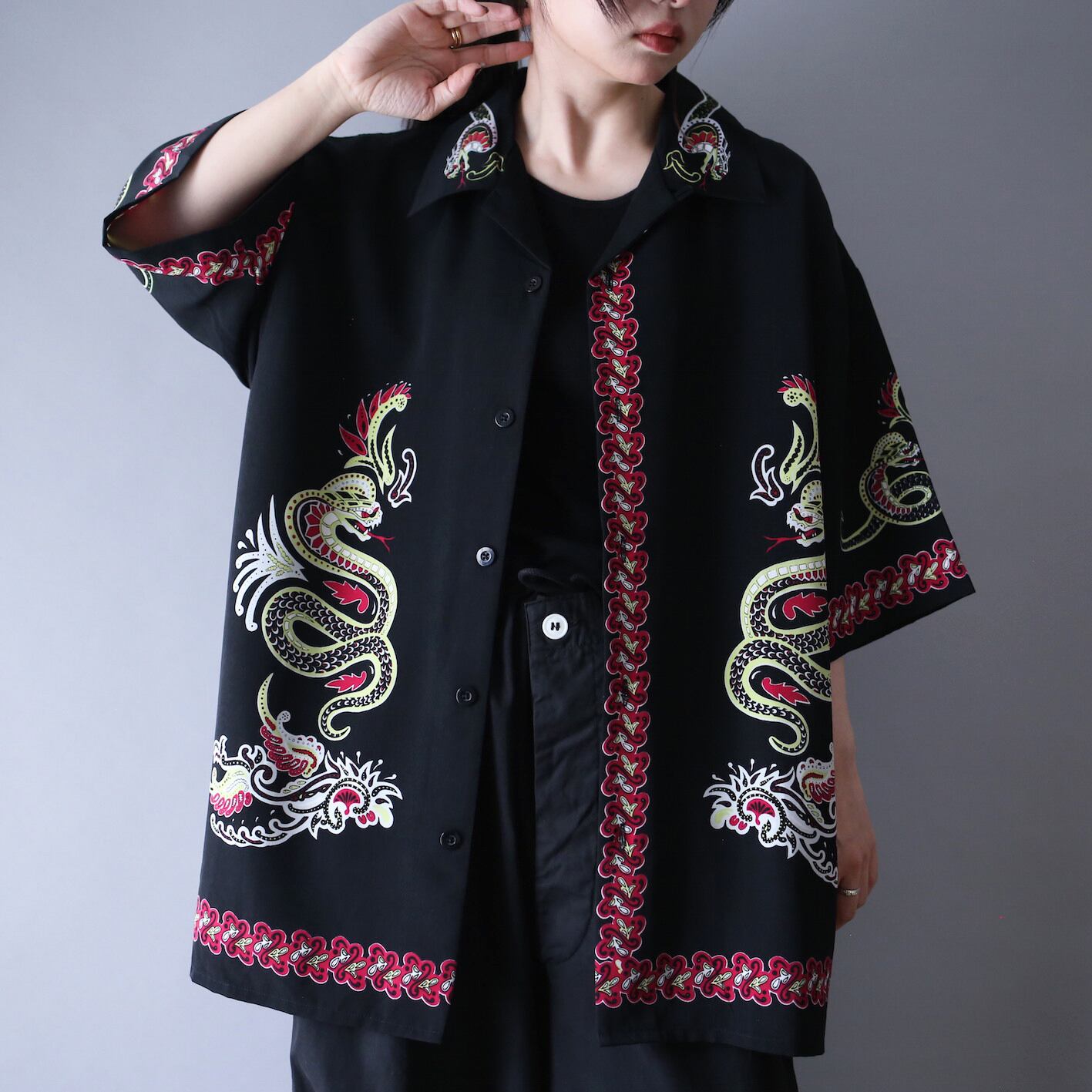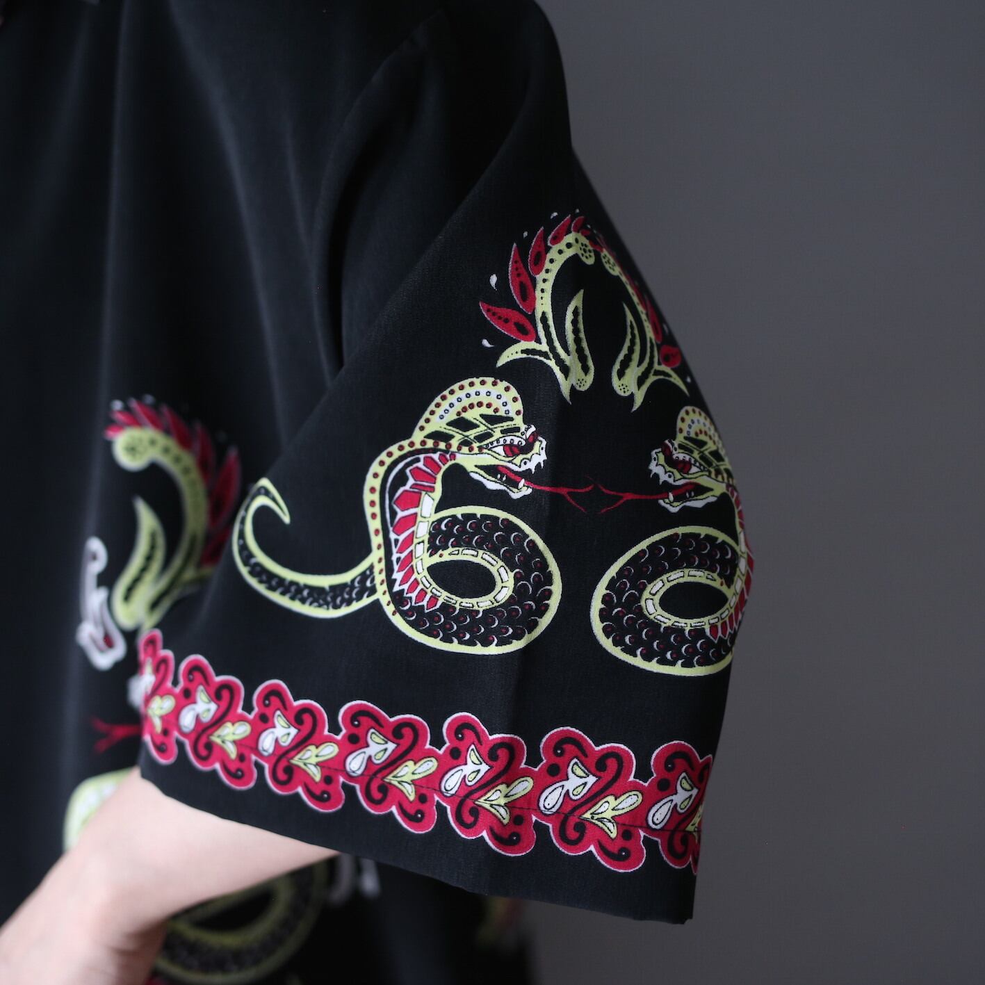 ブラックボディにイエローやピンクのネオンカラーが映え確定、360°全面に蛇のプリントを施した見応え満点の開襟シャツをご紹介。