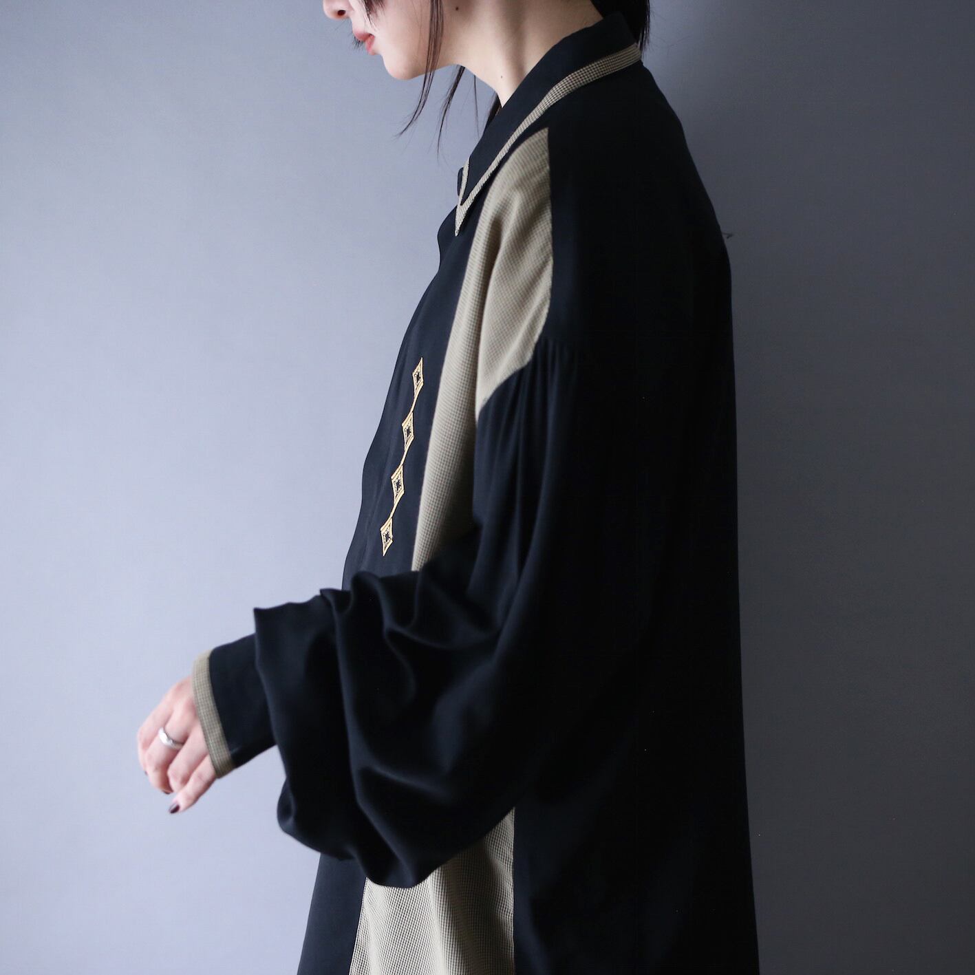 当店激推しの”比翼刺繍シャツ”より幾何学的な刺繍と襟・前身頃・袖口の黄金バランスである3点に切り替え生地が仕込まれたモード映えアイテムきました。